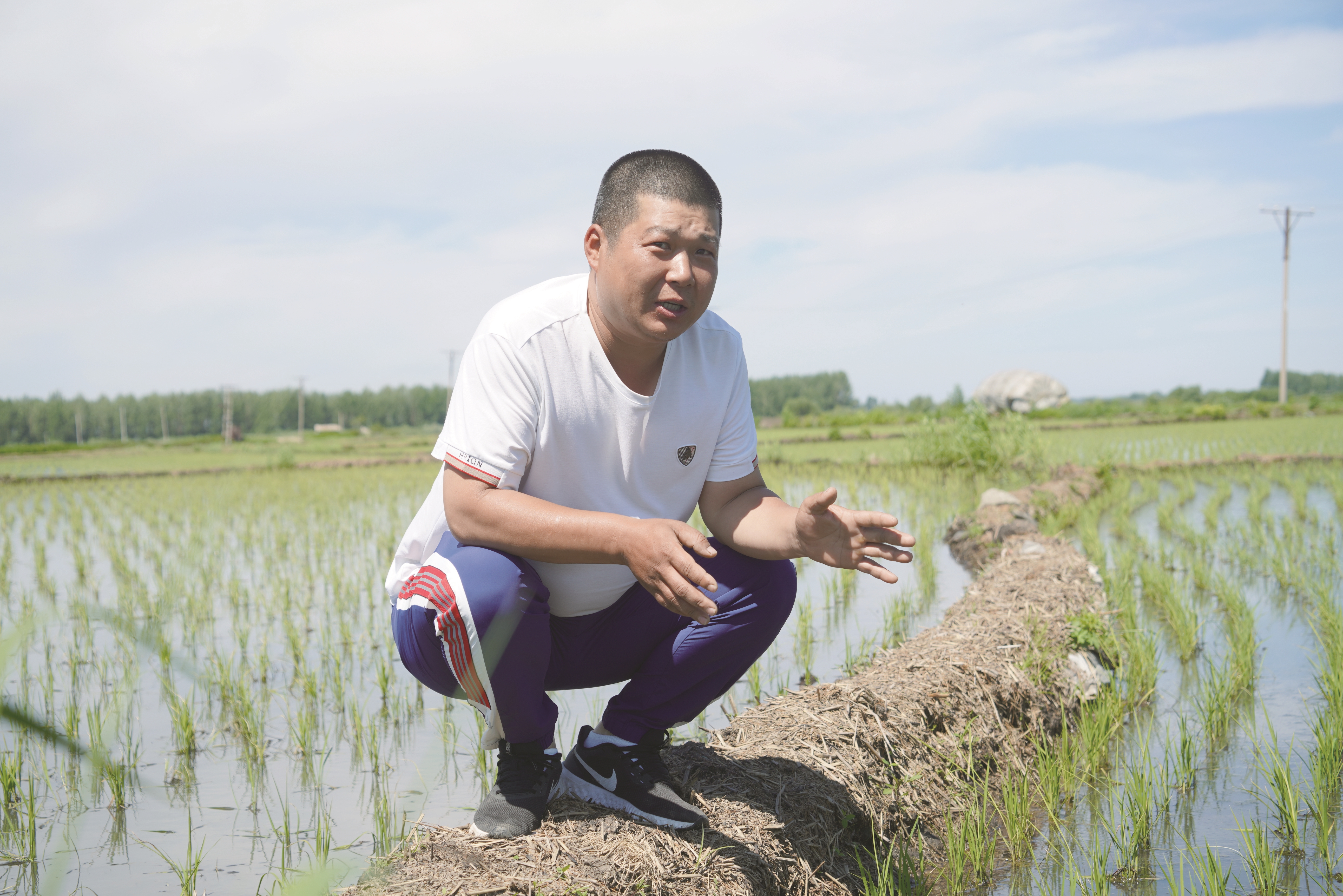 김문길씨가 논에서 푸르싱싱하게 자라는 벼모를 살피며 쌀 판매 구상에 대해 이야기 하고 있다./한동현 기자