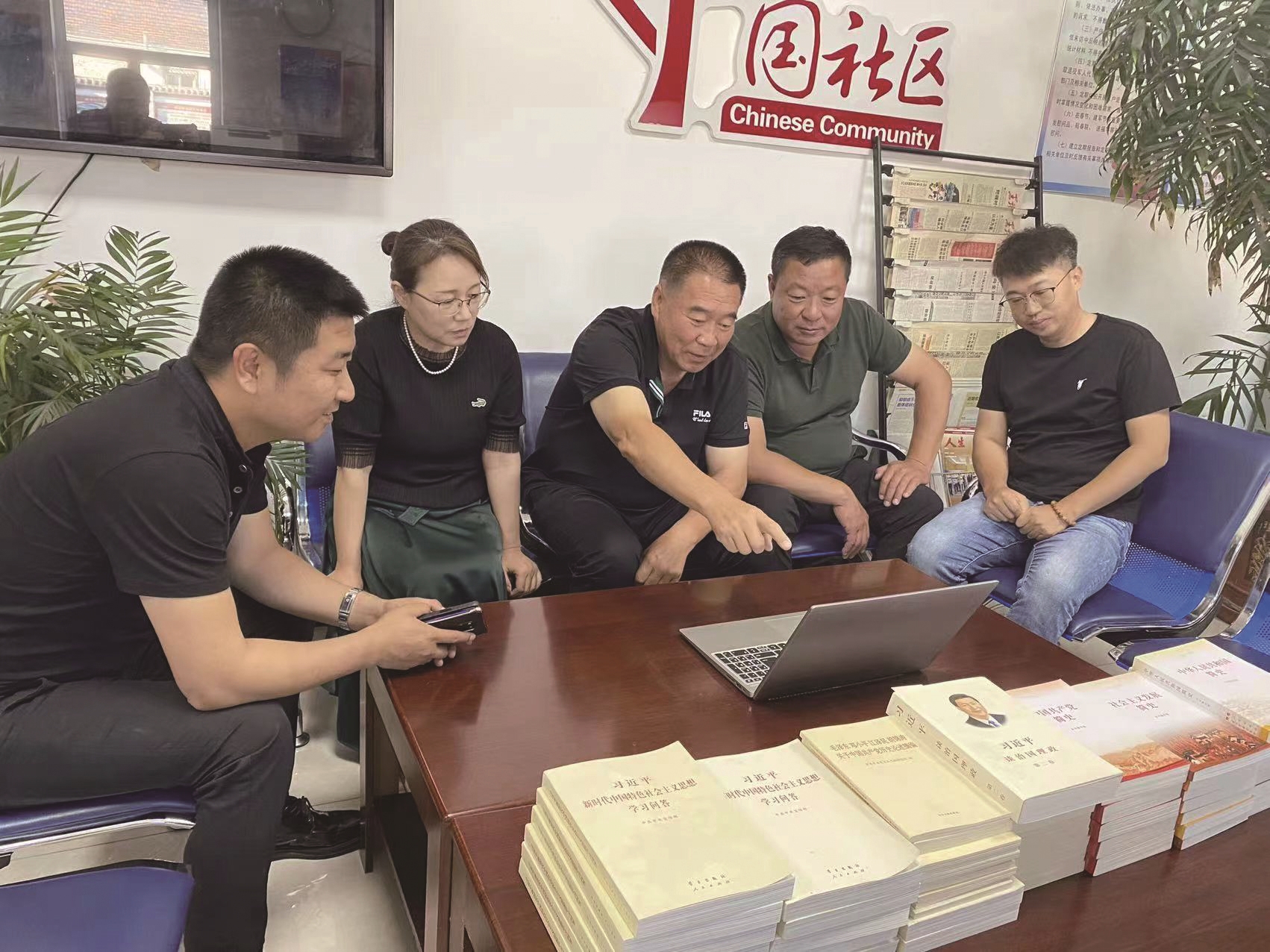 리석산 당지부서기(가운데)가 촌 지도부성원(좌1 장송, 좌2 조화녀, 우1 오운봉, 우2, 최건국)들과 단란히 모여앉아 사업을 토론하고 있다.