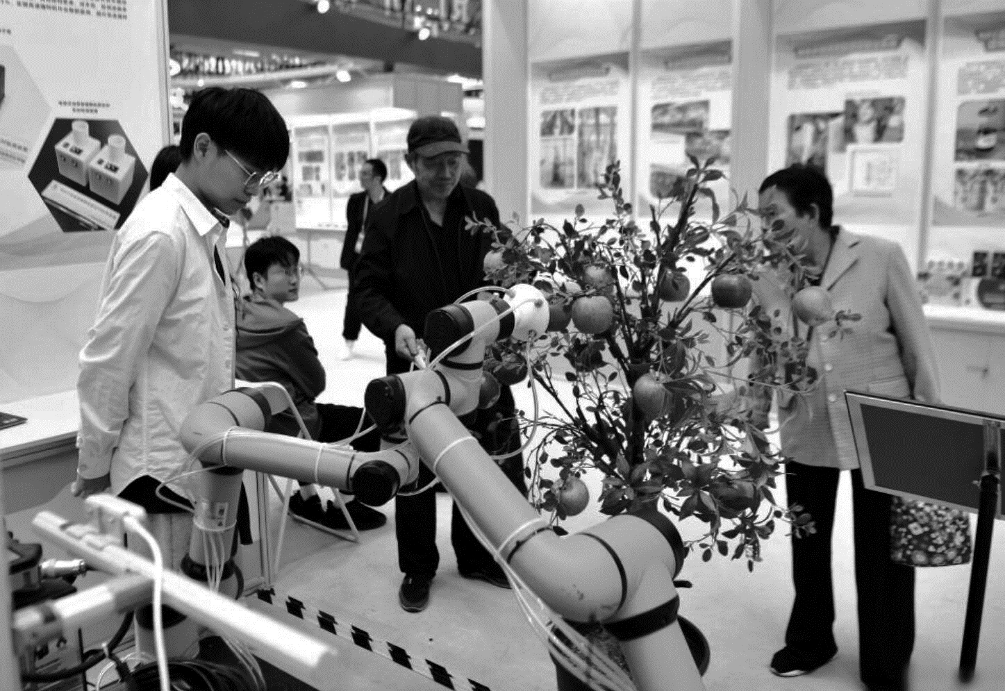 ‘제30회 중국 양릉농업 하이테크 성과박람회’가 산서성 양릉에서 열리고 있다. 이번 박람회에는 수천가지의 새로운 농업 기술이 전시돼 관람객의 관심을 끌고 있다. 사진은 관람객들이 21일 ‘제30회 중국양릉농업 하이테크 성과박람회’에 전시된 채집 로봇을 살펴보고 있는 장면이다. /신화사