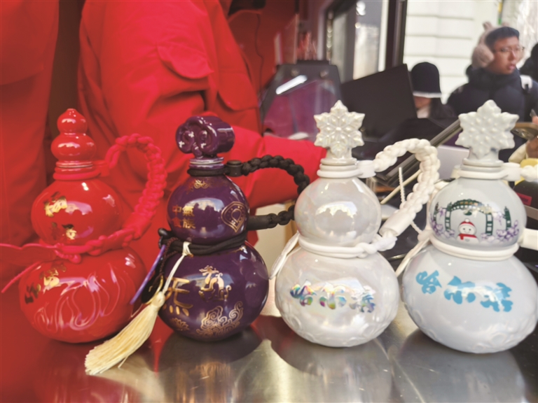 记者在中央大街与西九道街交叉口看到,在中气食族中药金方茶饮亭前市民排起长队,争相购买新品宝葫芦中医奶茶。奶茶口味有2种,玫玫枣枣和阿胶姜姜,均是基于祖研独家中药配方研制,是中气食族品牌继中医冰激凌之后新推出的又一健康饮品。奶茶分装在不同颜色的“宝葫芦”中,分别为红色的“鸿运年年”、冰蓝色的“冰雪尔滨”以及紫金色的“紫炁东来”3款寓意不同的宝葫芦。“红葫芦”寓意热烈、温暖、繁荣,瓶身布满火焰立体浮雕,浮雕中“福禄东方”的烫金烤花文字,寓意鸿运东来;“蓝葫芦”瓶身是冰雪般纯净的蓝釉色,瓶身底部覆盖哈尔滨市花紫丁香浮雕,葫芦上绘有中央大街标志和“哈尔滨”文字烤花图案,属于“冰雪尔滨”的纪念款;“紫葫芦”瓶身布满烫金祥云和紫灵芝纹饰,中间以“炁”字、“中气食族”金字以及“铜坐龙”金纹为装饰,寓意吉祥瑞兆、如意在握。