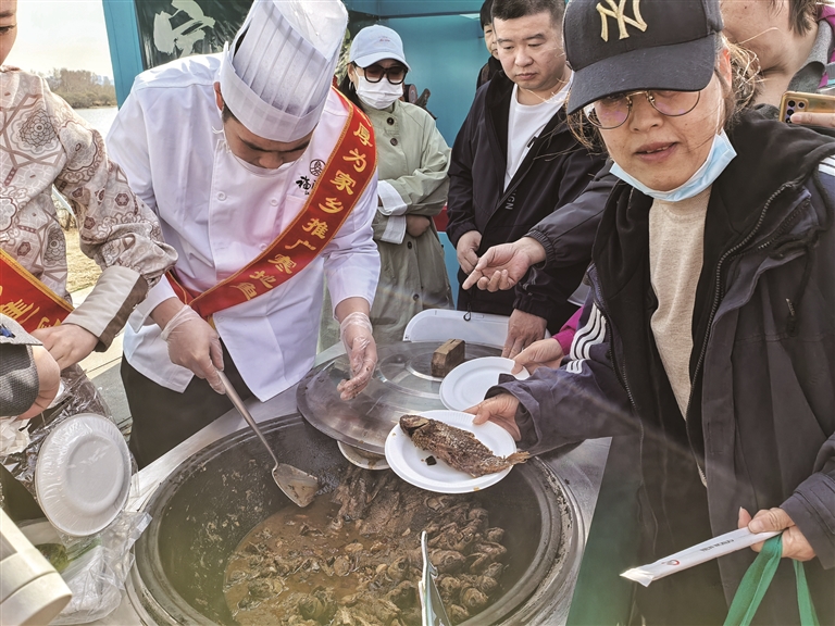 在松江宴展位,同样聚满了前来品尝的市民和游客。主打精品江鱼的松江宴首次参加开江民俗文化周,带来了家常焖香鲤鱼、蒜香排骨、酱焖牛尾巴鱼等10道菜品,短短一小时,就被近百人“品尝一空”。“大家纷纷给出了很高的评价,我们临时追加制作,让更多的人能体验美食。”松江宴店长刘国彬笑着说,已经有几位顾客在此等候新菜品,锁定美味。