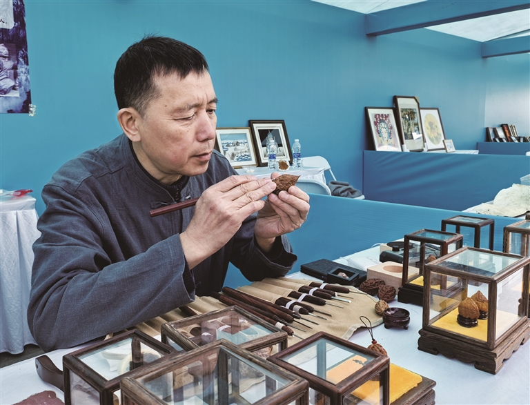 省非物质文化遗产雕刻秋果核桃技艺代表性传承人杨富长团队特意为开江民俗文化周制作了“开江鲤鱼”紫砂泥塑。杨富长告诉记者,紫砂泥塑是通过紫砂矿石的粉碎、风化、浸泡、过滤挤压成泥,完成后再经过高温烧制,最终形成紫砂作品。这条“开江鲤鱼”寓意鱼跃龙门,乘风破浪,祝福我们的家乡越来越好。