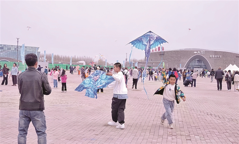 园区内,1314平方米的超大嬉沙池成为儿童乐园,小铲子、小推车等工具在沙堆上“建造”出一座座梦幻城堡;生态露营区的免费天幕与帐篷供不应求,游客自带美食享受野餐时光,感受城市中的自然野趣。文创店推出“消费领风筝”活动,每日限量百只风筝引发排队热潮。
