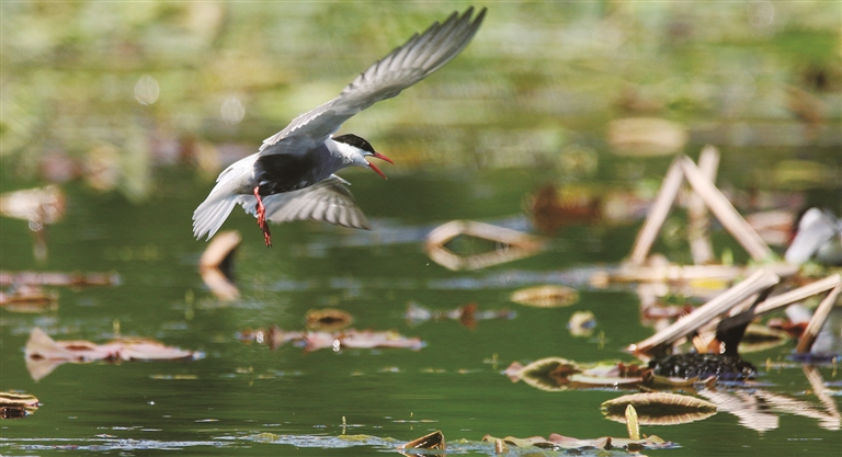 宽阔的湿地水面,凤头鸊鷉在巢内孵化着小鸟、白骨顶鸡为了宣誓领地不时发生激烈的打斗、苍鹭与池鹭蹑手蹑脚寻找着浅水处的小鱼……连绵的湿地,不时上演着生动与精彩。