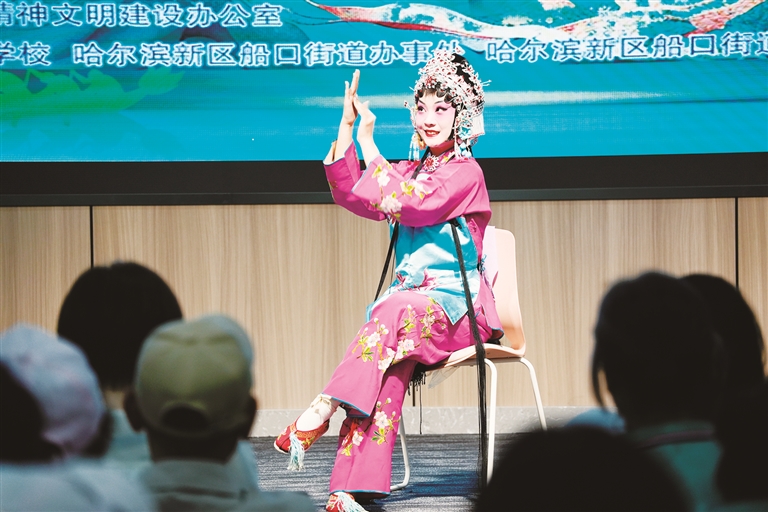 随后,黑龙江艺术职业学院带来京剧展演,7个经典曲目以“边演、边讲、边听、边看”的新颖形式呈现,让大家近距离领略中华戏曲的独特魅力,感受传统文化的深厚底蕴。戏曲展演结束,社区居民们来到文创空间,开启“赏非遗”之旅,鱼皮画、桦树皮画、手工剪纸、彩泥、书法、绘画等非遗作品令人赞叹。哈尔滨新区风华学校的教师带领现场观众亲手制作,体验非遗技艺的精妙。在二楼大厅,“包粽子”活动同步开展,粽叶、糯米等材料一应俱全,大家围坐在一起,在欢声笑语中包出一个个粽子,将端午的温暖与甜蜜带回家。