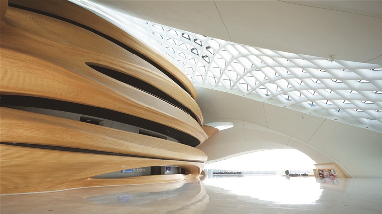 蜚声国内外的青年建筑设计师马岩松设计团队,将北国雾凇的灵动、冰川裂隙的神秘转化为建筑语汇,创造出三维曲面的钢结构建筑奇迹,具有大跨度、高空间等特点,项目设计、建设难度及工艺复杂性在全国乃至世界都极富挑战性,其中部分设计建设元素为世界首创,同时填补了国内剧院建设的诸多技术空白。