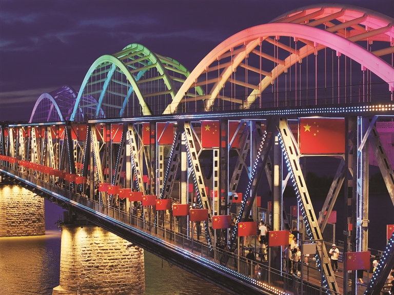 日前,哈尔滨市滨洲铁路桥桥头,“隆重纪念中国人民抗日战争暨世界反法西斯战争胜利80周年”的立体铁艺主题造型安装完毕,桥身800余面鲜艳的五星红旗耀眼闪亮,将这座百年老桥装点成亮丽的“国旗桥”。据悉,这是哈尔滨市为纪念中国人民抗日战争暨世界反法西斯战争胜利80周年特别打造的红色地标。