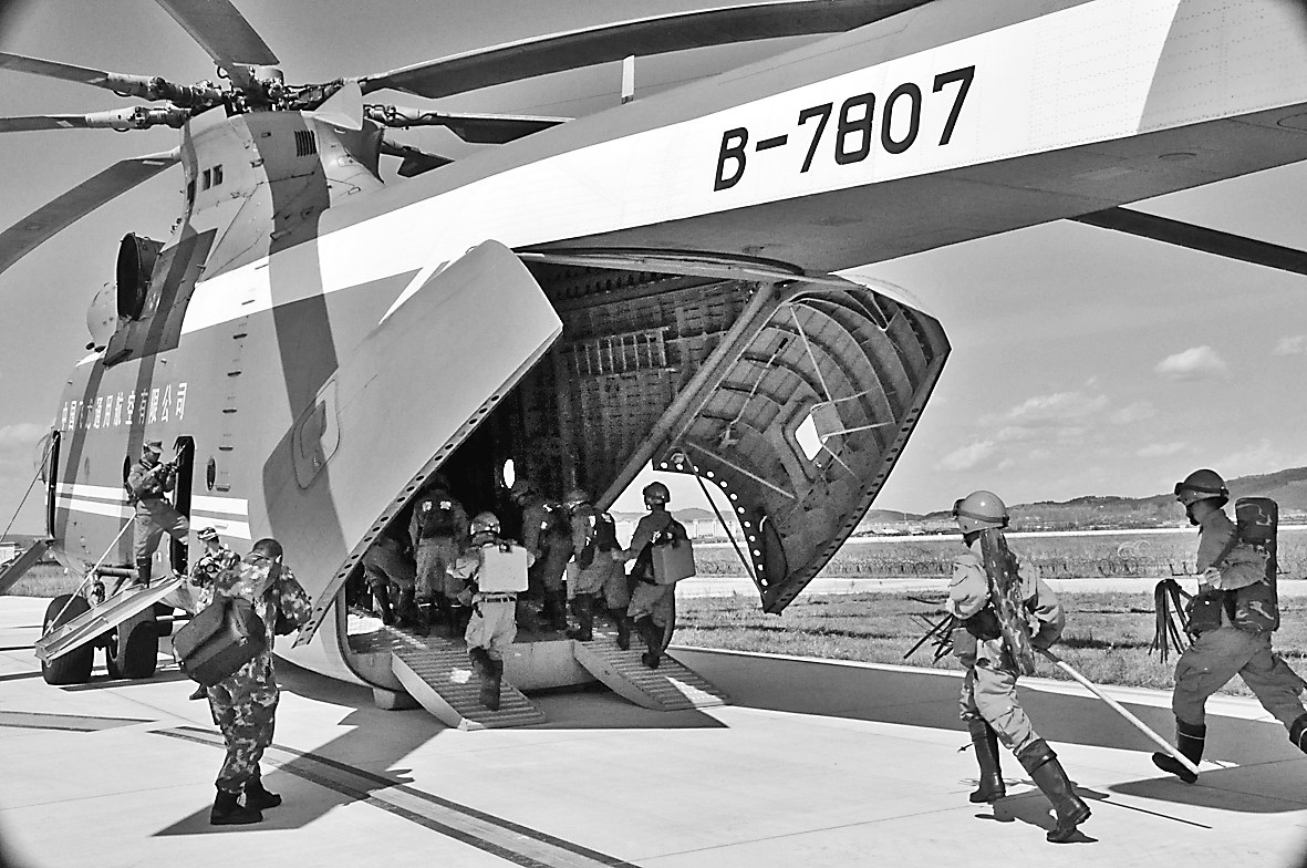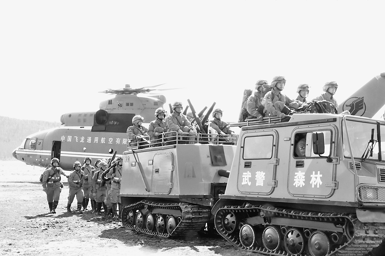 5月17日下午,武警大兴安岭森林支队出动一台全道路森林消防车和35名执勤官兵,与加格达奇航空护林站联合开展机载精兵重装远程输送、实机滑降和空中指挥员训练。他们依托米—26直升机对南翁河、松岭等高火险区实施空中巡护,并在指定机降地点草丛中进行机动演练和空中灭火药剂喷洒等科目的演练,以提高部队灭火作战能力。