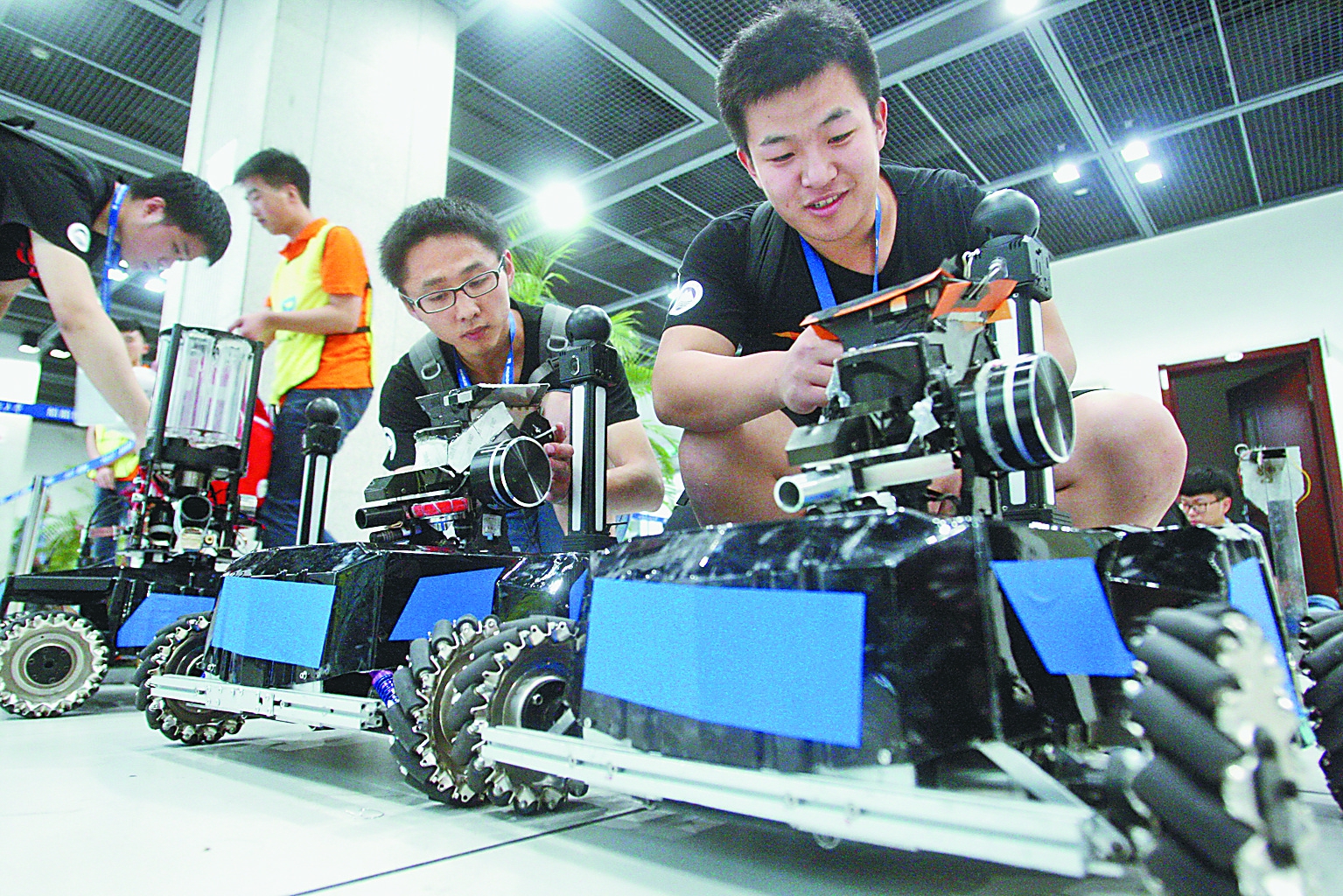 6日,2015“全国大学生机器人大赛”东北分区赛在哈尔滨工程大学举行。这是一场与以往比赛不同,而类似真人CS的全新机器人对抗的比赛。参赛双方各派五名“机器人”分别承担步兵、射手、炮手、哨兵等角色,在复杂地形中相互较量,进行“实弹”射击对抗,完成指定任务,最终由电子裁判系统判断比赛胜负。 据了解,本届大赛共吸引来自全国150余所高等院校的240支参赛战队踊跃报名。经过严格遴选,最终157支机器人战队获得参赛资格。图为参赛队员在对机器人进行调试。 唐晓伟本报记者苏强摄