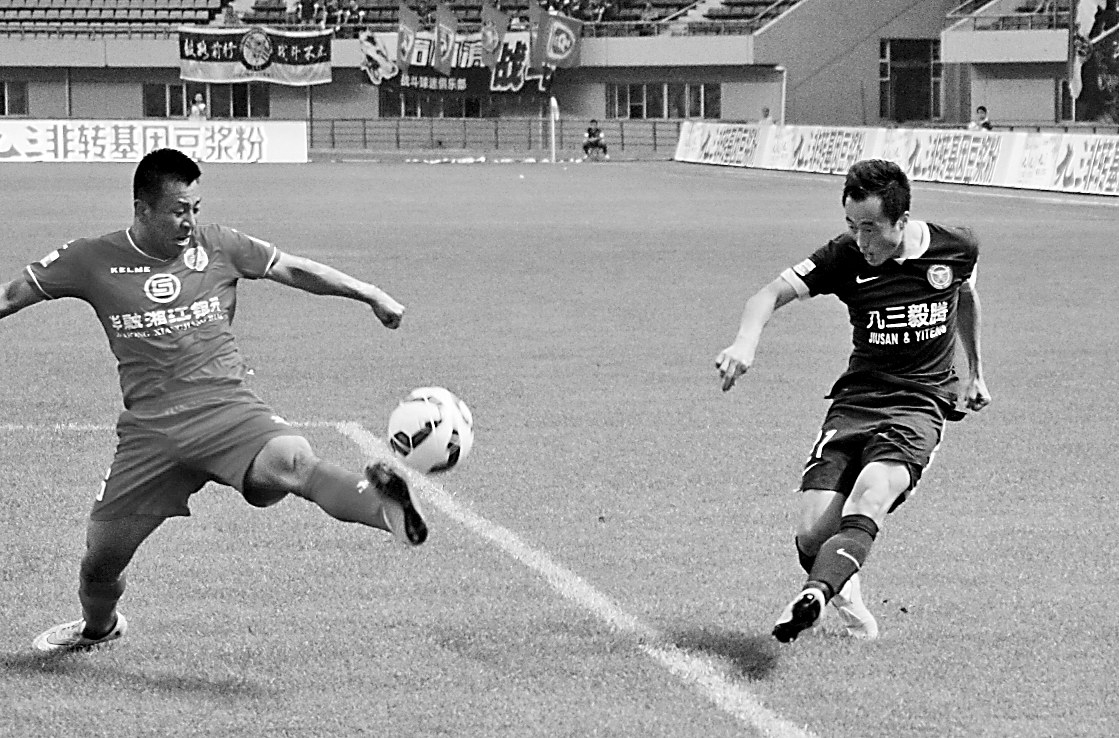 27日,中甲联赛第15轮,哈尔滨毅腾队韩旭攻入一球,主场1比0小胜来访的湖南湘涛队,从而以5胜9平1负收场。7月4日,毅腾将主场迎战青岛中能。 本报记者王志强摄