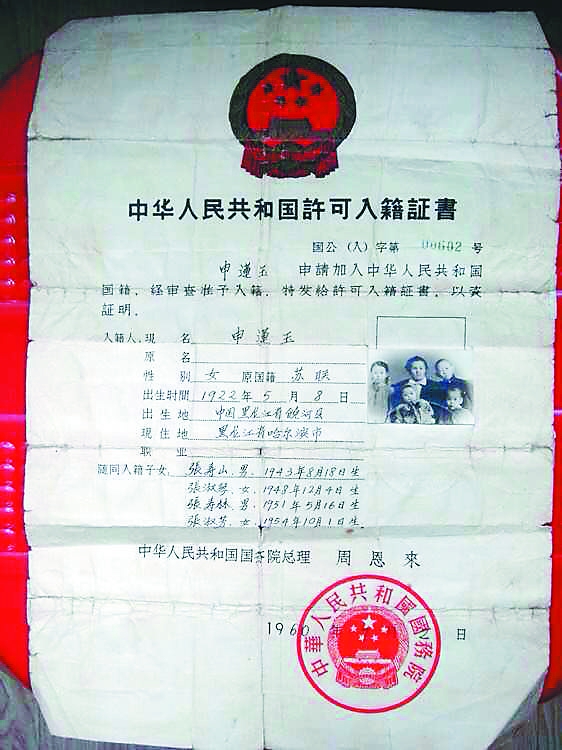 申连玉:女,朝鲜族,生于1920年,祖籍吉林省延吉县,曾是东北抗日联军第七军战士。1936年,加入崔庸健部队,1938年4月经崔庸健、张玉杰介绍加入了中国共产党。 □本报记者董新英 走进哈尔滨市松北区托斯卡纳小区申连玉老人的家,老人因为腿伤只能倚坐着,对于记者的提问,96岁的申连玉老人已经听不太清楚,看到她的小女儿张淑华拿出抗联时期的老物件照片,她才开始断断续续的回忆抗联经历。 “我的那些战友都比我年纪大,都不在了,我很想他们……”讲述中她说着一个一个战友的名字。张淑华对记者说,妈妈曾说,能够走上抗日道路,是她一生中最正确的抉择,在沦陷的土地上,没有少女的青春,只有投身于抗日的洪流里,才是她最好的归宿。 老人曾向子女们讲述当年的战斗。申连玉在虎饶地区参与的西林子战斗是她记忆最深的。1937年,东北抗联第七军成立了妇女队,她就是其中的一员,她在密营里同战友们一起从事缝制军装和筹备给养等工作。1939年,她被调到第七军第三师被服厂工作,也就是在这一年,她同第七军的刘琦树同志相恋并结婚。那年冬天,天气格外寒冷,战友们饮冰雪、宿风寒,吃树皮、草根,随时可能战死、饿死和冻死。这场战斗中申连玉的好多战友都牺牲了,她新婚的丈夫刘琦树也献出了年轻的生命。那时申连玉已有了身孕,孩子还没出生就没有了父亲,她拖着沉重的身子继续参加战斗。大雪封山,部队在行军转移,走在积雪没膝的行军路上,有的同志在前面开路,后面的人一个接一个地踩着脚印走。 面对敌人的疯狂进攻,战友们与敌人展开了生死搏斗,女兵们也非常勇敢,她们冒着枪林弹雨抢救伤员,为战友包扎伤口、抬担架。申连玉在这次战斗中成功地救了一名战友。由于当时的医疗条件以及长期在恶劣的天气下行军打仗,申连玉的体力早已透支。1940年2月她和另外几名同志由王效明和李永镐二位领导护送前往前苏联治病,她在那里做了几次手术,病好后就留在了国外。尽管怀有身孕,身体孱弱,身高只有一米五的申连玉在离开祖国的那一刻,仍然背着三四十斤重的老式手摇缝纫机,她还想给战友做军装。 申连玉的第一个孩子是在前苏联出生的,他是战斗英雄刘琦树烈士的遗腹子。到苏联后,申连玉在勃利市生活,在面包房工作过,七年后,也就是1947年,她与东北抗联第六军战士张洪远组成了新的家庭。1955年,申连玉一家回归祖国,但他们的回归并不顺畅,最后还是周恩来总理签字才准许他们重新加入了中国国籍。至今他们一家还保存着周总理签发的入籍证书。 张淑华说,妈妈这一生有五个孩子,四个孩子都是在前苏联生的,只有小弟是回国生的,所以他们兄妹都有俄语名字,她的大儿子张树山,苏联名字叫吉玛。大女儿张淑清,苏联名字叫娜塔莎。二儿子张树林,苏联名字叫西罗沙。小女儿张淑华,苏联名字叫约拉。张淑华说,回国后,中央领导非常重视他们一家,经国家民政部安排,他们一家六口人最终定居哈尔滨。申连玉没有向国家要工作,也没向国家要待遇,她把那份中华人民共和国内务部(后更名民政部)的批文压在了箱底。 图①申连玉(右)在家中接受本报记者采访。 图②申连玉从前苏联回中国的入籍证明,周恩来总理签发。 本报记者王志强摄