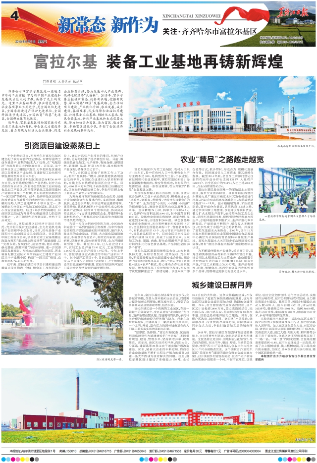 □邵英明本报记者姚建平 齐齐哈尔市富拉尔基区是一座驰名中外的工业重镇,曾为新中国工业建设和发展做出巨大的贡献,赢得了无上的荣光。这里工业基础雄厚、农业特色明显、社会各项事业长足进步,是全国文化先进区,全国非物质遗产保护先进单位,全国科技进步先进区,全国教育“两基”先进区,全国群众体育先进区。 近年来,富拉尔基区借助国家振兴东北老工业基地的契机,举全区之力建设开发区,着力围绕为驻区大企业服务,促进企业转型升级,努力发展四大产业集群,做好吃配经济“大蛋糕”。2015年,富拉尔基区把握新常态,抢抓新机遇,挖掘新优势,深入实施“四区”发展战略,全力推动项目建设、产业优化升级、农业发展、城乡建设、各项改革、民生保障和法治红岸建设,打造装备工业基地、钢铁化工基地、绿色食品基地、新兴产业基地和生态宜居之城,努力加快实力富区、活力富区、魅力富区、幸福富区建设步伐,开创了全区经济社会发展的崭新局面。 引资项目建设蒸蒸日上 半个多世纪以来,齐齐哈尔市富拉尔基区建立起了较为完善的工业体系,有着厚重的工业存量资产,富集的技术人才优势,在“吃配经济”方面有着巨大的发展空间。近年来,这个区举全区之力建设开发区,力争把开发区建成足以支撑富区产业发展、加速新型工业化和引领发展转型升级的大平台。 富拉尔基经济开发区规划总面积26.48平方公里,按照地理位置和产业结构,划分为东北部综合启动区、西北部重型配套工业和绿色食品加工产业区、西南部钢铁化工及新型建材产业集中区等三个板块,初步形成独具特色的“一区三园”的格局。如今,经济开发区经国家发改委等五部委核准为省级经济开发区,同年被列为哈大齐工业走廊15个项目区之一,并被确定为全国农产品加工创业基地、黑龙江中小企业创业基地。经过9年多的发展建设,目前园区已经成为齐齐哈尔市最具活力的经济引擎之一,省市领导先后视察园区,并给予充分肯定。 2015年,富拉尔基区以经济开发区为依托,充分利用现有工业基础,全力打造机电装备产业园和中小企业园,目前,机电装备产业园和中小企业园建设已全面启动。全区聘请中国工程咨询公司,结合制定老工业基地搬迁改造方案和“东丝绸之路经济带”发展战略,以“完善东北、发展西北、规划西南,提升功能、强化基础、改善环境”为总体思路,进一步完善园区发展规划。形成东北部综合启动区、西北装备配套工业区和西南冶金化工建材产业园区三个产业集中区,构建“一园三区”格局,总规划面积36.48平方公里。 近年来,富拉尔基区将项目引进和建设的着重点放在物流、仓储、粮食加工及制药等产业上,通过对这些产业项目的推进,拓展产业结构,更好地促进了经济转型升级。目前,围绕绿色食品加工、电子商务、物流仓储、新型建材、新能源、温泉(矿泉)水开发、温水稻米等产业谋划、储备项目近百个。 今年,全区重点在电子商务工作上下功夫,利用“互联网+”模式,探索搭建装备制造业电商平台,为园区企业进行大宗原材料采购,在线上独家代理销售园区企业产品。目前,4000余平方米的电子商务基地已经建设完成,正在进行内部装修工作,争取早日搭上电子商务这个新兴产业的顺风车。 为充分发挥现有装备配套企业优势,加强企业间配套协作和技术合作,实现抱团、集群发展,通过组织架构,由该区开发区鑫源特钢、富重传动、德达机械等3个企业牵头成立机电装备产业协会,现有11个理事企业,协会会员将达到30个;协调北钢配套企业,筹建特种金属材料协会,不断提高企业市场竞争力和抵御市场风险的能力。 为进一步加大招商引资的力度,全区出台和完善了一系列的招商引资政策,为中外客商投资和生产营造出最优的环境氛围,使许多入驻这里的企业受益。同时,大力强化基础设施建设,积极盘活存量资产,利用定向招商、派驻招商、以商招商、载体招商等手段,全力开展招商引资工作。截至2014年,已入驻企业113户,实现工业总产值32.91亿元,工业增加值6.25亿元,固定资产投资4.9亿元。今年上半年,富拉尔基区重点推进的市级产业项目17个。其中新开工项目9个,目前已陆续开工建设,6个建成投产项目已全面复工,2个加快建设项目也正在有序推进,富拉尔基经济开发区已成为全区经济发展的重要增长极。 农业“精品”之路越走越宽 富拉尔基区作为老工业城区,农村人口只占10%左右,其中在农村人口中从事农业生产为主的不足30%,是典型的大工业、小农业区。在发展现代农业进程中,富拉尔基区积极引导农民调整种植结构,转变种植观念,向有限的土地要效益,走出一条农业增效、农民增收的“精品”农业发展之路。 为加快农村融入城市的步伐,区委、区政府充分发挥大工业小农业的优势,积极推进农业“旱转水、低转高、种转牧、分转合和卖转加”的“五个转”,全力打造“小而优、小而精、小而强”的都市型农业,推动全区现代农业发展整体上水平。全区耕地24万亩,其中水田面积6.5万亩,经济作物面积达到5000亩,其中蔬菜面积4000亩。设施农业发展步伐加快,蔬菜大棚、温室达到2000栋,占地面积2000亩。绿色食品开发走在全市前列,无公害种植面积发展到18万亩,全区拥有全国驰名商标1个,省著名商标5个,有机食品标识43个、无公害农产品标识15个,绿色食品标识11个。目前