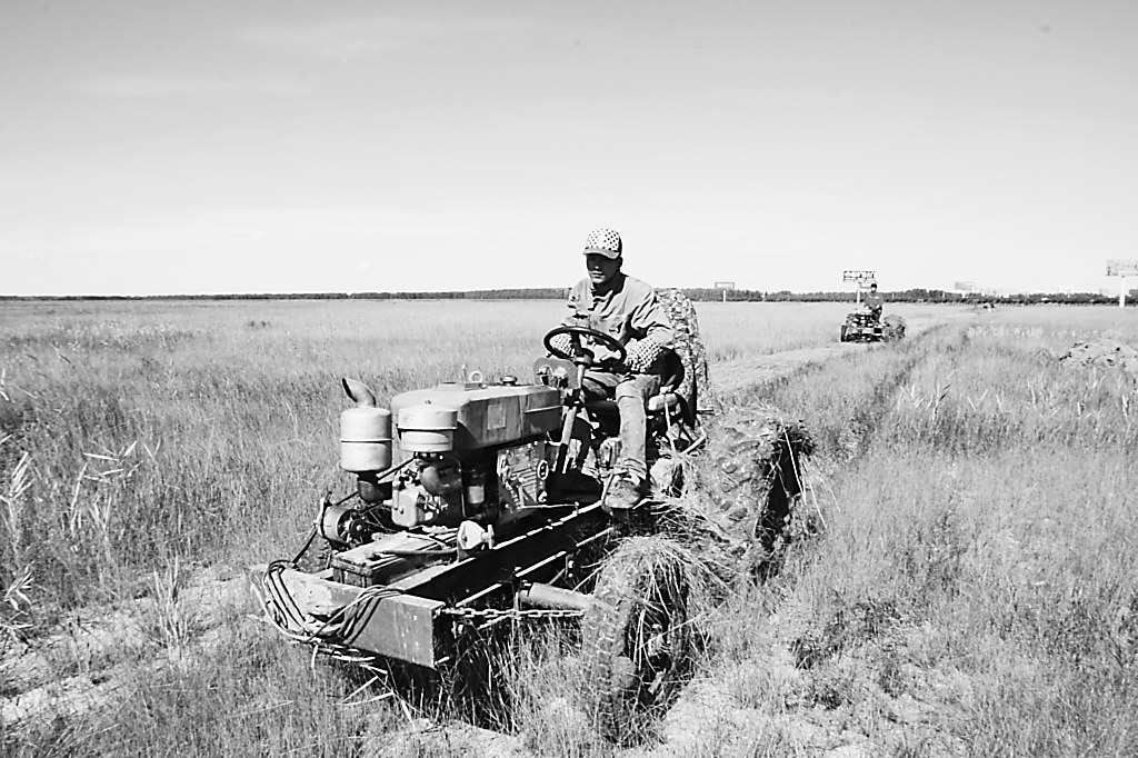 日前,在肇东市肇东镇新民村附近的盐碱地里,农民们驾驶拖拉机收割羊草,之后将打包运往养牛场。据了解,盐碱地一般植物很难生长,羊草是个例外。羊草营养价值高,是喂养牲畜的好饲料,肉牛吃了长膘,奶牛吃了产好奶。 本报记者苏强摄