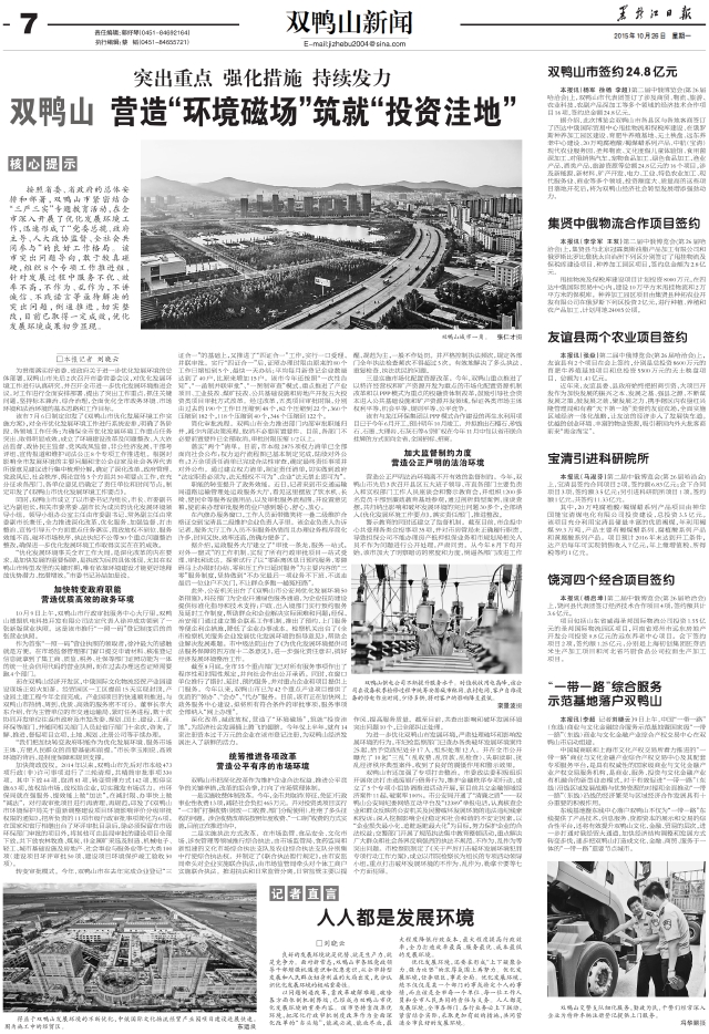 本报讯(杨军徐杨李超)第二届中俄博览会(第26届哈洽会)上,双鸭山市代表团签订了涉及商贸、物流、旅游、农业科技、农副产品深加工等多个领域的经济技术合作项目16项,签约总金额24.8亿元。 据介绍,此次博览会双鸭山市各县区与各地客商签订了四达中俄国际贸易中心甩挂物流和保税库建设、在俄罗斯种养加工园区建设、育肥牛养殖基地、无土秧盘、远东养老中心建设、20万吨腐殖酸/褐煤蜡系列产品、中航(宝清)现代农业服务园、圣邦物流、文化度假儿童体验馆、食用菌深加工、对俄销售汽车、宠物食品加工、绿色食品加工、渔业产品、酒类产品、旅游资源等总额24.8亿元的16个项目,涉及新能源、新材料、矿产开发、电力、工业、特色农业加工、现代服务业、商业等多个领域,投资额度大、质量高的这些项目落地开花后,将为双鸭山经济社会转型发展增添强劲动力。