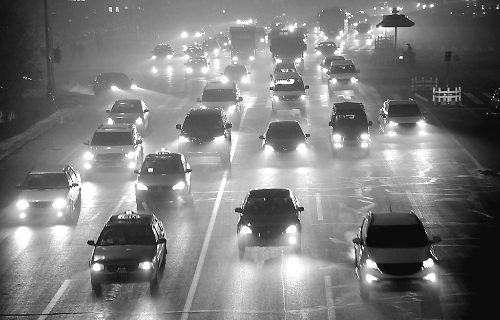 10日夜晚,哈尔滨市主城区形成冻雾,能见度不足50米,一些主要街路的车辆都打开双闪,市区车行速度放缓。