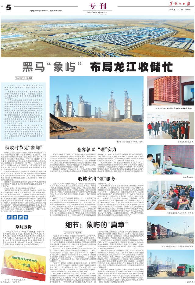 □本报记者宋晨曦 入冬时节,龙江大地,秋收“保卫战”落下帷幕,此时,确保颗粒归仓的“攻坚战”正在打响。 来自东南沿海之滨的厦门象屿股份,在龙江初冷乍寒的冬日积蓄着一年的收获。这匹闯入广袤黑土地的“黑马”肩负起让粮食颗粒归仓的使命。 今年初,黑龙江象屿农产有限公司与黑龙江金谷粮食集团有限公司合资企业挂牌成立。随后,富锦象屿金谷农产有限公司和北安象屿金谷农产有限公司两个全资子公司注册手续相继完成了。公司从事农业供应链运营管理与流通服务,涉及上游土地流转、种子培植、肥业生产和合作种植服务,中游粮食收购、烘干、仓储、运输等流通服务,下游分销及深加工业务。 享有“北国粮都”美誉之称的富锦市,是象屿选中的粮食收储、加工的基地之一,与象屿携手并肩,在黑土沃野,以全新视角,共同打造现代农业产业链。 2015年粮食收储工作,是“象屿模式”在富锦能否博得农民认可的关键环节。近日,记者来到富锦象屿金谷农产有限公司,亲身感受“象屿”在秋粮收购中秉承着公开、严谨、守信、规范的工作作风,亲见象屿如何让粮食颗粒归仓,完成使农民增收的工作目标。 秋收时节见“象屿” 绵延几公里的大货车分四路汇集富锦象屿金谷农产有限公司外等候送粮,警车徘徊在各个路口维持秩序;飞机场地般宽阔平坦的院内广场上,称重、检验、卸粮、烘干等一系列交粮工作有条不紊地进行,一座座大粮仓按编号排列等待蓄粮;检验检测大厅里,工作人员各司其职,认真工作。透过玻璃墙,农民在休息室里一目了然。一张告示“请水稻客户当天结算,换取发票,否则无法打款”提醒往来农民打款须知。晚17:00,免费餐厅厨房大锅菜荤素搭配,品类齐全,白开水供应充足。 初到富锦象屿金谷农产有限公司,记者见到的场景只能用“大”字去形容。大货运、大广场、大粮仓……来往车辆的喇叭声与烘干塔的轰鸣声不绝于耳,所有工作人员穿着标志性制服,各司其职,在东北寒冷的冬日里,这里上演一幕幕热火朝天的收粮景象。 富锦象屿办公室里随处可见忙碌的工作人员,但却不见所有管理者的身影,原来,他们都在收粮现场,指挥、监督各个工作环节。 在办公室里,一面大红锦旗映入记者眼帘—— “我们是富锦市福来玉米种植专业合作社员,今年我们与象屿合作种植了2250亩玉米,喜获丰收,我们要感谢象屿!我们玉米种植的面积比较大,贷款额度与实际需求相差太多,备耕生产时,我们生产资金和物资还没有着落,整天为此事发愁,在此危难之时我们了解到象屿合作种植项目来到富锦,经过审核,今年有幸与象屿签署了合作协议。象屿提供生产资金、优良品种和化肥等生产资料,还介绍了先进的农业生产技术并跟踪服务,在秋收卖粮时提供了送粮快速通道。最让我们感恩的是,在今年玉米价格下滑情况下,象屿为保障合作户的利益,每斤给我们加价3分钱,使我们的收入得到了保障。我们明年还要扩大与象屿的合作种植面积。” 仓容彰显“硬”实力 记者从省粮食局了解到,为了发挥中央补助资金四两拨千斤的作用,既完成仓储能力建设,又增加玉米加工能力两个目标的原则,省粮食局与象屿股份合作,在富锦园区设计仓容能力350万吨;北安园区设计仓容能力100万吨。为了能够缓解今年的收储矛盾,象屿股份紧锣密鼓,自筹资金,建设粮食仓储项目及配套设施项目。现在富锦园区的180万吨仓容已完成,目前,已具备350多万吨收储能力并投入使用。 富锦象屿金谷农产有限公司具备50余栋仓容3.3万吨的砖混平房仓和40余栋钢结构库及900余个简易露天钢结构囤等收粮仓容。在库、囤里全部配有机械通风和电子测温设备。目前,粮食烘干塔、输送机、各种风机、化验仪器、运输车、铲车等设备全部启动运行。在富锦象屿金谷农产,整个秋收场面类似好莱坞大片里的大工厂,规模宏大、却有条不紊。 富锦象屿金谷农产有限公司常务副总经理王长林介绍,公司现有国家政策性粮食库存102.33万吨,2015年预计收粮260万吨左右。在粮食管理中,严格按照中储粮“一符”、“三专”、“四落实”及两个确保的要求,实现了粮食数量真实、质量良好、储存安全、管理规范。确保高标准完成2015年粮食收购任务。 收储突出“强”服务 王长林说:“为保证粮食收购工作有序进行,重点要把好六关,即扦样关、检质关、检斤关、接卸关、结算关、安全关。各部门一切从粮食接收工作出发,―切为了接收,一切服从接收,切实做好做实粮食收购的各项工作。”全体员工都统一着公司工作服挂牌上岗,严格执行国家粮食局提出的“五要五不准”粮食收购守则。提供优质服务,为农民排忧解难,千方百计为售粮农民提供方便。 各环节工作人员于8月初全部配齐上岗。首先召开了员工入职大会,开展军训,岗前安全教育,业务技能培训,然后按照各业务环节分别进行岗位业务学习。本着干啥学啥、干啥会啥的原则进行培训,确保粮食收购开始都能独立胜任工作。富锦象屿金谷农产有限公司的化验员说:“我是农村孩子,但是却不会种地,前几年外出打工,也没挣啥钱,听说家乡建了这么正规的公司,就回来了。经过夏天的上岗培训,我十分重视这份工作,也了解到,检验员的工作很关键,农民的粮食来之不易,一年到头就等着卖粮钱呢,我们不能有一点马虎。” 象屿的到来也促使地方加快推进土地流