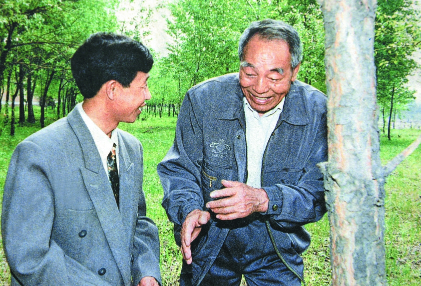 马永顺(右)与新时代的植树模范孙俊福(左)交流造林经验。