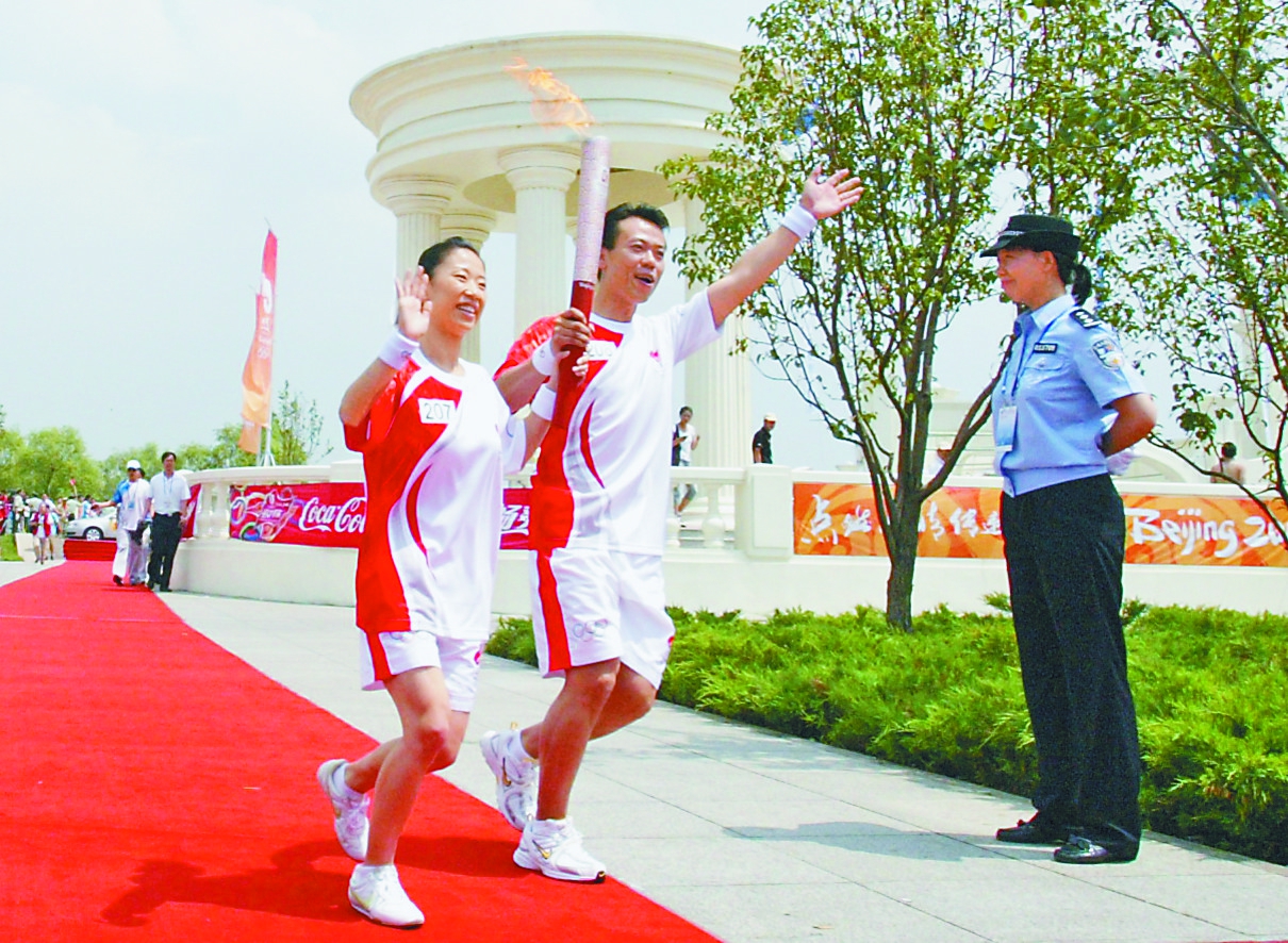 2008年7月11日,北京奥运会圣火在哈尔滨首站传递,花样滑冰世界冠军申雪、赵宏博传递火炬。 本报记者蒋国红摄