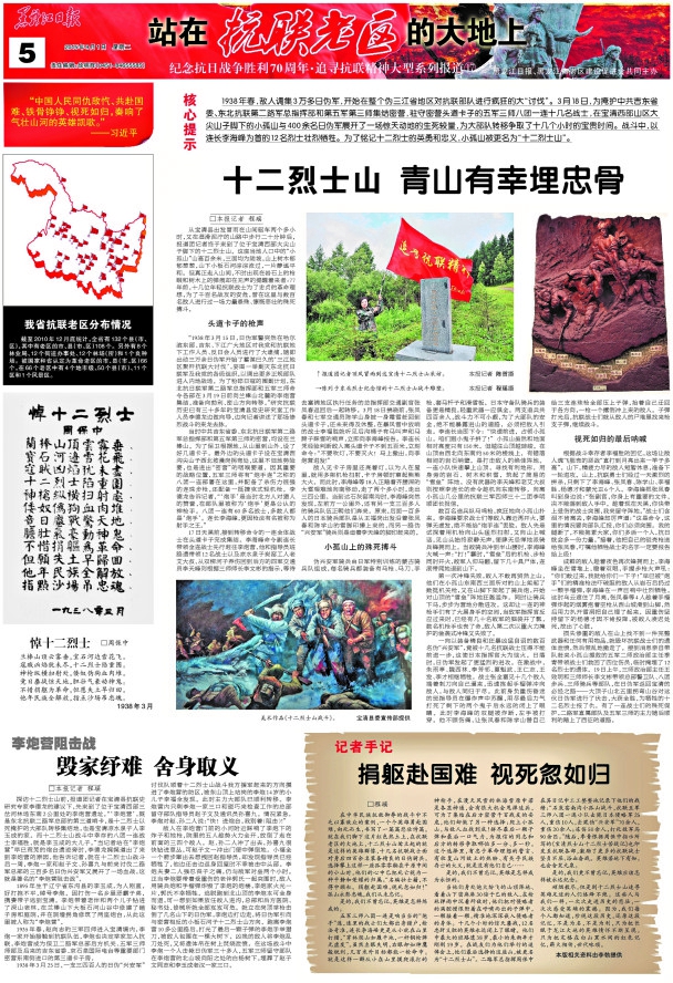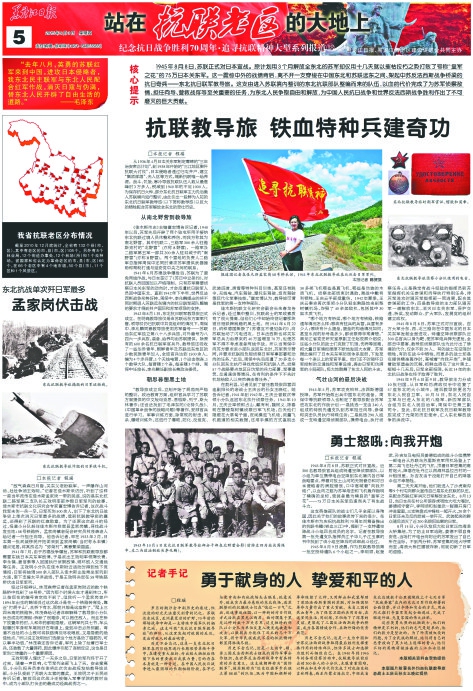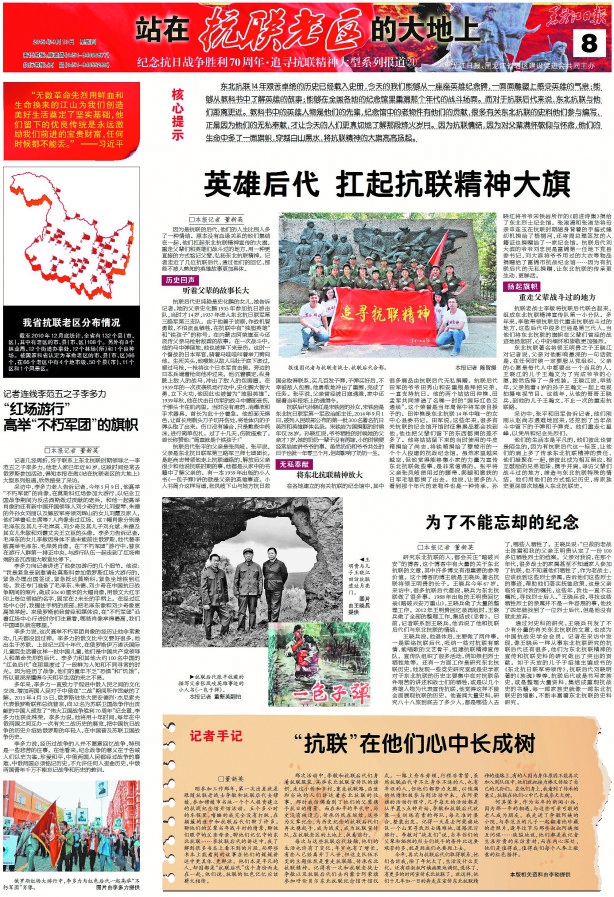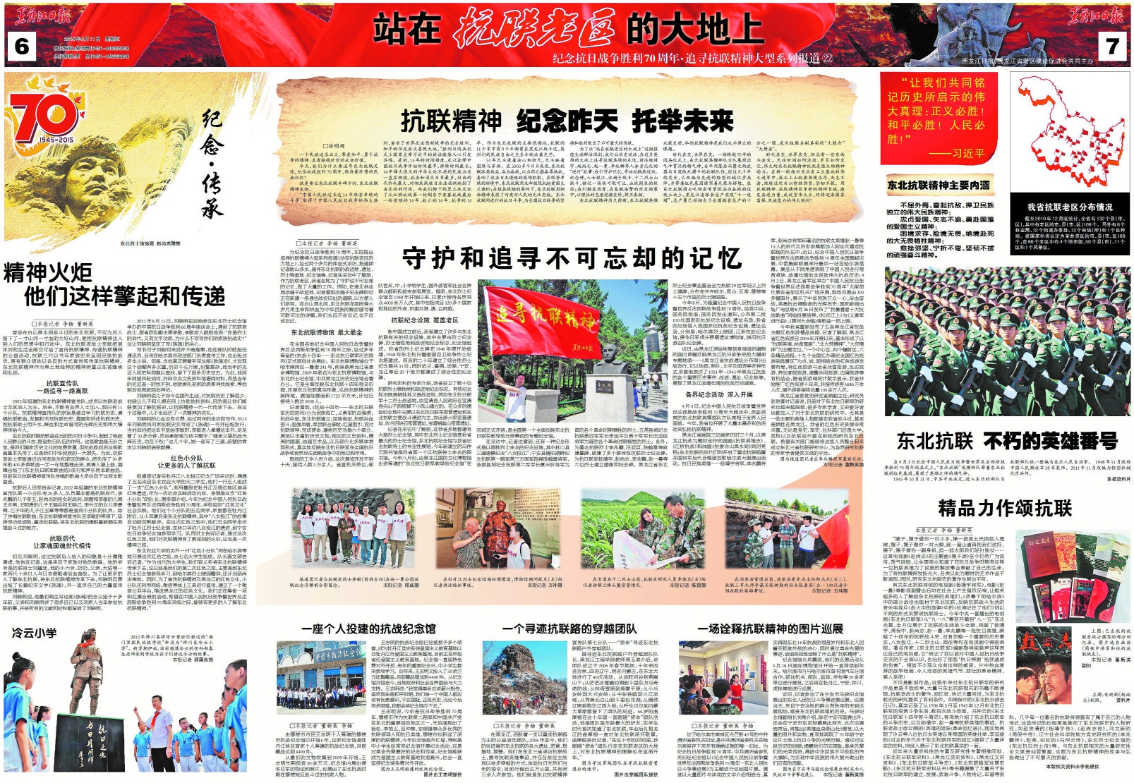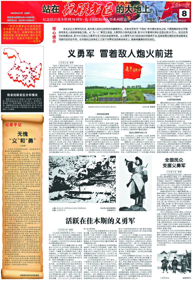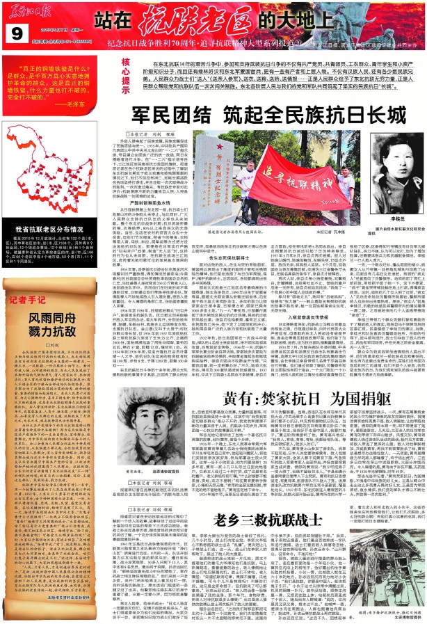 为纪念中国人民抗日战争抗日战争胜利70周年,本报从7月7日起推出《站在抗联老区的大地上》大型系列报道。 15位记者组成报道团,从6月起兵分多路奔赴尚志、汤原、林口、伊春等省内多个抗联老区,通过寻访抗联后人,实地踏查抗联遗址遗迹,力图还原艰苦卓绝的抗联斗争史,勾勒出鲜活生动的抗联英雄故事。 推出的近30个版大型系列报道,包括《英雄祭 民族魂》、《夜袭汤原出奇制胜载军史》、《抗联密营 破碎山河的最后堡垒》、《李兆麟 跃马三江屠日寇》、《铁血战歌“团结起,夺回我河山”》等等。 这个大型系列报道再现七八十年前发生于我省的艰苦卓绝的抗日战争,歌颂可歌可泣的抗联英雄,弘扬勇赴国难、百折不挠的伟大抗联精神,提醒、引领后人铭记那段历史、珍惜美好生活、建设富强国家。