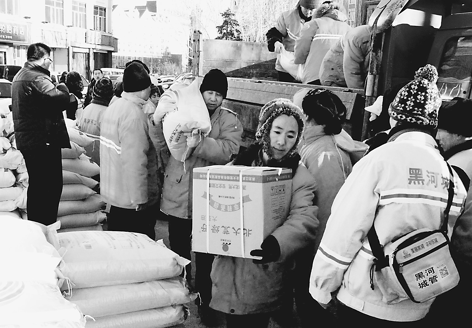 近日,黑河市总工会将价值5万元的米面油,送给百名工作在严寒一线的环卫工人和城管执法系统困难职工,表达工会组织的问候与祝福。据了解,这是黑河市总工会每年在两节期间开展的“寒冬送暖”系列活动之一。 张辉本报记者邵国良摄