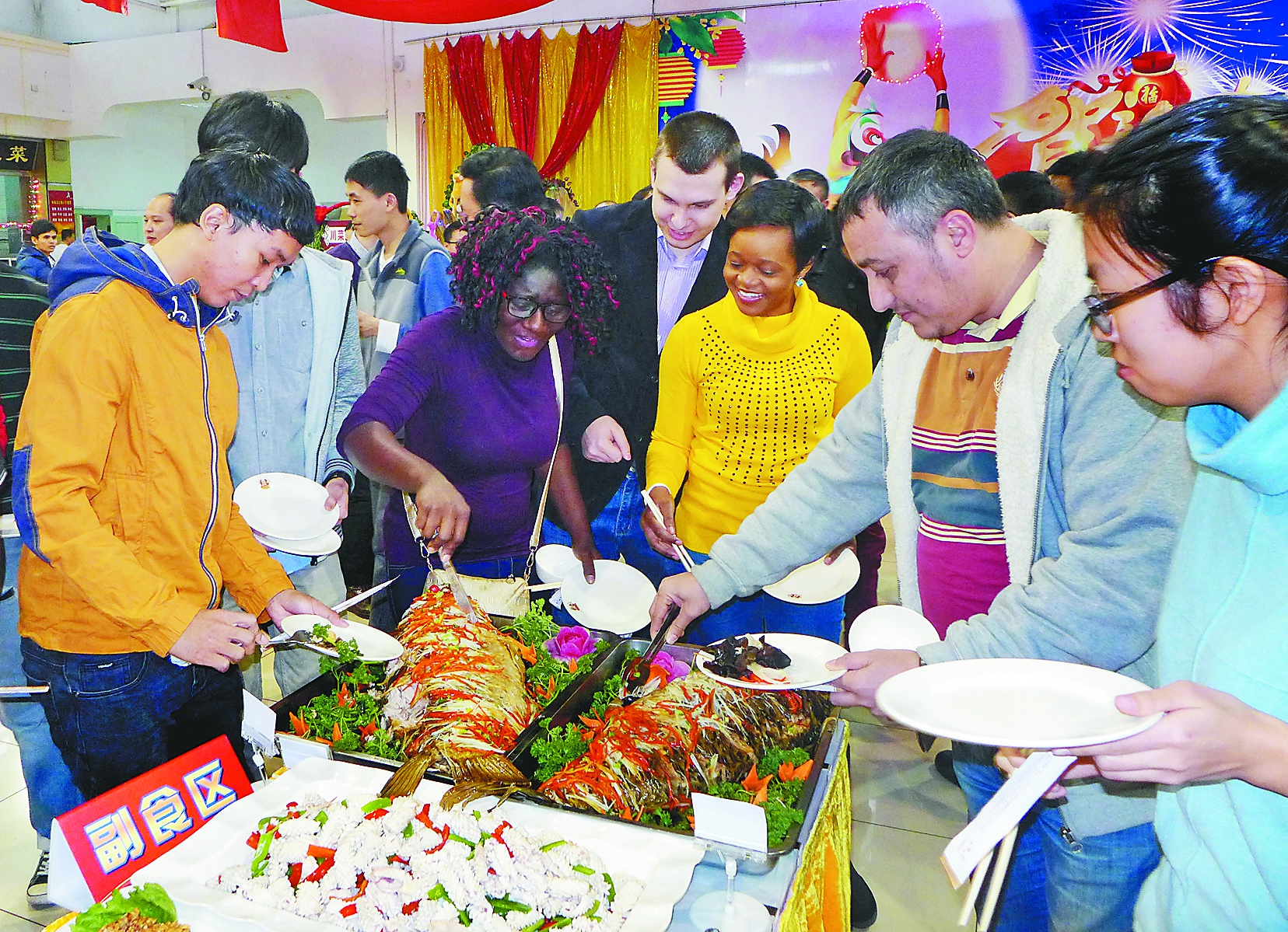 据介绍,哈尔滨工业大学春节期间共有796名学生留校过年,其中包括376名外籍学生。为了使留校学生能度过一个平安祥和的假期,哈工大推出了系列丰富多彩的亲情活动。图为留学生纷纷品尝极具特色的中国传统美食。 冯健本报记者王振良摄