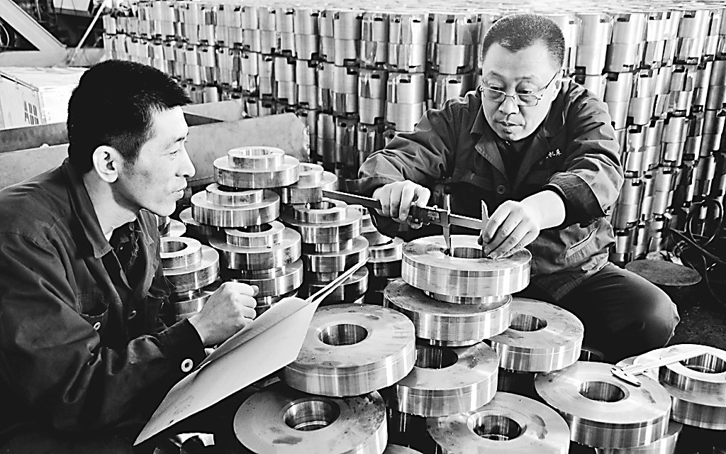 齐齐哈尔华工机床股份有限公司作为国内唯一的“物理测试专用设备研发基地”,预计今年可实现销售收入4500万元,税金480万元。据悉,该公司生产的“冲击试样加工中心”“钢铁板材生产线”等金属物理检验检测领域专用机床,广泛应用于国内各大钢铁企业。图为工人正在为机组零件精准测量。 邹博宁本报记者邵国良摄