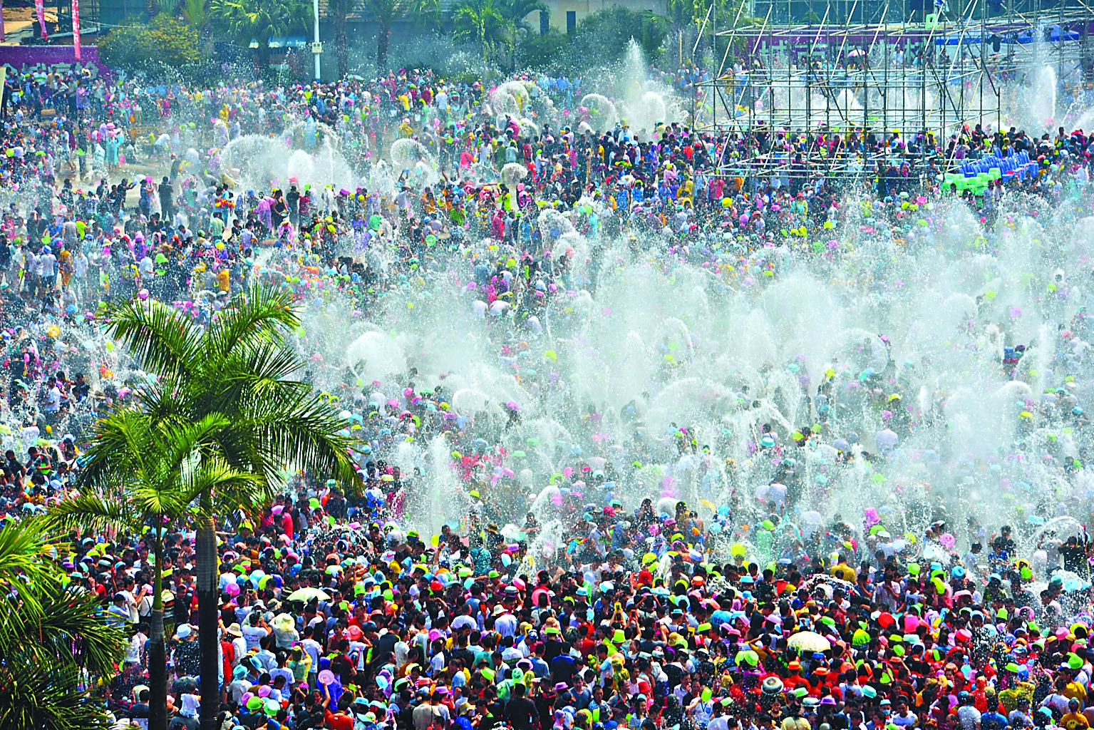 4月15日,人们在西双版纳景洪泼水广场参加泼水狂欢。当日适逢泼水节,在云南西双版纳景洪市,数万名当地群众和外地游客齐聚泼水广场,泼水狂欢,互送祝福。 新华社发