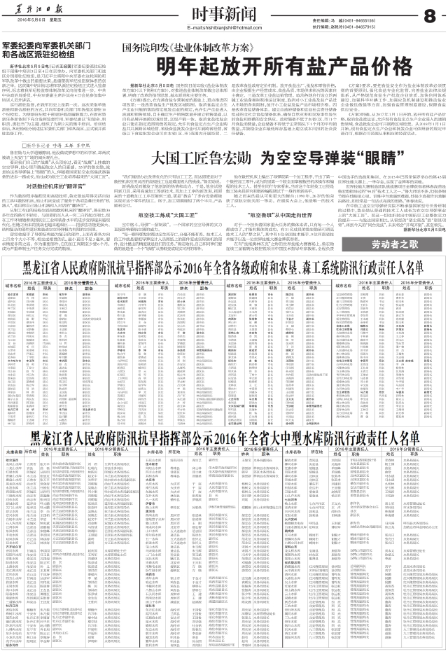 黑龙江省人民政府防汛抗旱指挥部公示2016年全省大中型水库防汛行政责任人名单