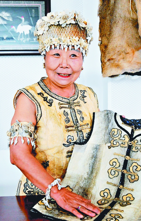 尤秀云在展示她制作的鱼皮衣。本报记者邵国良摄
