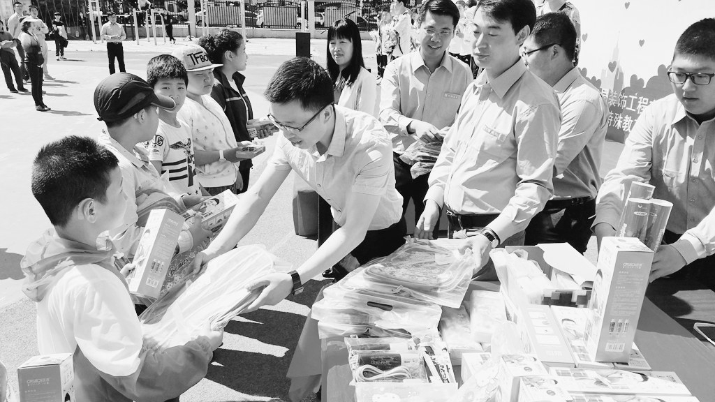 1日,中建二局装饰工程有限公司“爱与饰界童行·叩响无声的世界”——关爱聋哑儿童主题党日活动在哈尔滨特殊教育学校举行。活动启动仪式上该公司的工作人员向孩子们捐赠了文教用品,并带领孩子们驱车前往哈尔滨永泰城乐园进行游玩。图为工作人员正在向孩子们捐赠文教用品。 本报记者李天池摄影报道