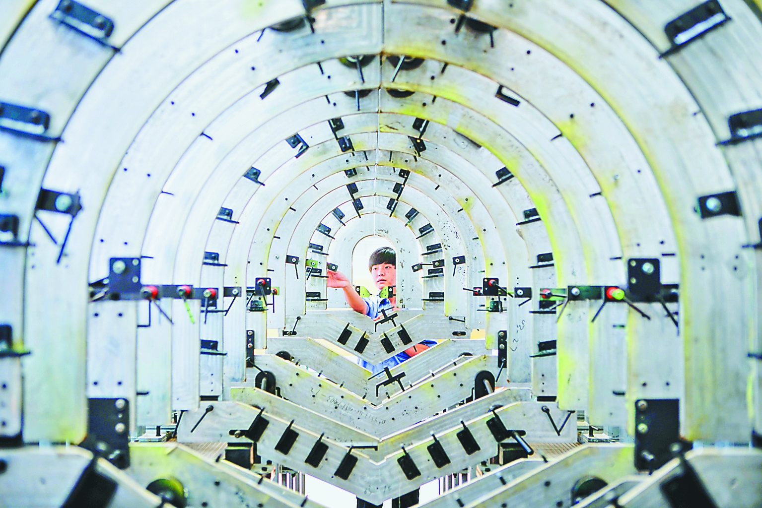 据了解,该公司引进国际先进的加工技术和装备,大力发展航空产品零部件和整机制造业务,拥有较强的制造能力,具备了大型飞机零部件制造能力。承担了中航工业旗下多家企业的零部件配套生产任务。图为工人检视生产AG600水陆两栖飞机左右浮筒的工装型架。