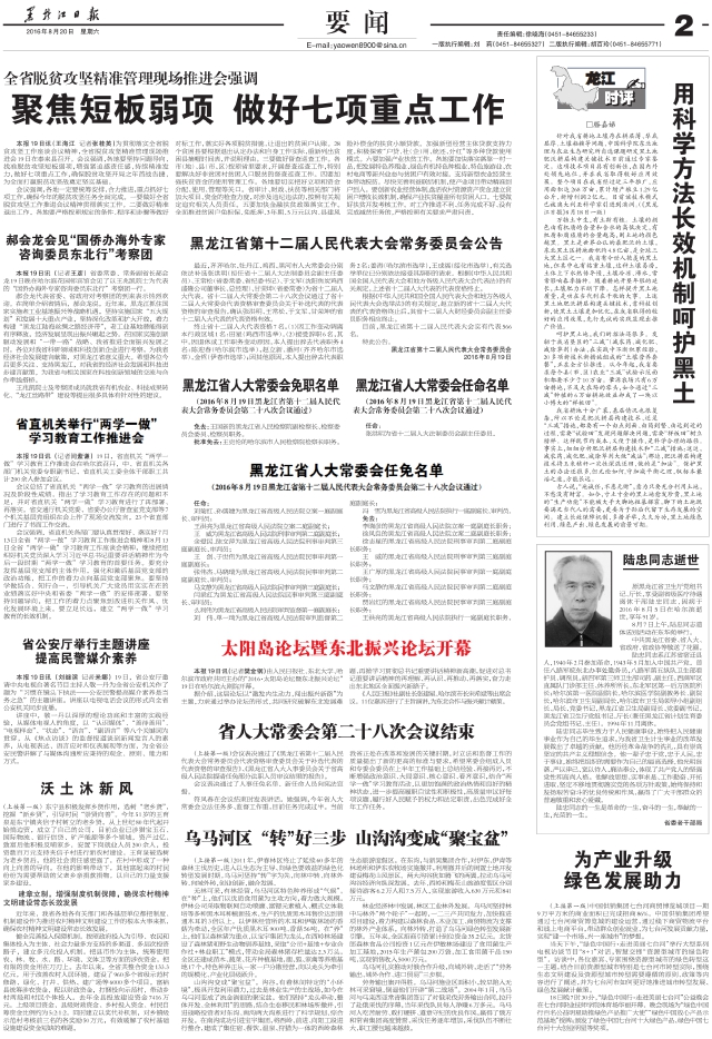 本报19日讯(记者闫紫谦)19日下午,省十二届人大常委会第二十八次会议结束。 省人大常委会党组书记、副主任符凤春主持下午举行的第二次全体会议;党组副书记、副主任赵敏,副主任陈述涛、胡世英、庞义华、朱清文,秘书长于柏青出席会议。 省政府副省长吕维峰,省高级人民法院院长石时态,省人民检察院检察长徐明列席会议。会议表决通过了《黑龙江省非物质文化遗产条例》《黑龙江省森林防火条例》《黑龙江省乡镇人民代表大会工作条例》《黑龙江省人民代表大会常务委员会关于废止〈黑龙江省关于保护农村专业户合法权益若干问题的决定〉等20项决议、决定的决定》《黑龙江省人民代表大会常务委员会关于批准〈哈尔滨市人大常委会关于修改哈尔滨市新型墙体材料发展应用和建筑节能管理条例等五部地方性法规的决定〉的决定》《黑龙江省人民代表大会常务委员会关于批准2015年省本级决算的决议》《黑龙江省人民代表大会常务委员会关于进一步加强行政审判工作的决定》。 会议听取了关于《黑龙江省人大常委会关于视察全省铁路建设情况的报告》审议情况的汇报,《黑龙江省人民政府关于行政许可“一法一例”实施及优化我省经济发展环境情况的报告》审议情况的汇报,《黑龙江省人民政府关于2016年上半年国民经济和社会发展计划执行情况的报告》审议情况的汇报,《黑龙江省人民政府关于2016年上半年预算执行情况的报告》审议情况的汇报,《黑龙江省人民政府关于2015年度省本级预算执行和其他财政收支的审计工作报告》审议情况的汇报,《黑龙江省人民政府2015年省本级决算(草案)》审议情况的汇报,《黑龙江省高级人民法院关于行政审判工作情况的报告》和《黑龙江省人民检察院关于规范司法行为工作情况的报告》审议情况的汇报。 以上审议意见连同有关报告,会后交“一府两院”研究处理,要求按规定时限将有关情况报告省人大常委会,同时向省人民代表大会代表通报并向社会公布。 (下转第二版) (上接第一版)会议表决通过了《黑龙江省第十二届人民代表大会常务委员会代表资格审查委员会关于补选代表的代表资格的审查报告》、《黑龙江省人大人事委员会关于省高级人民法院提请任免部分法职人员审议结果的报告》。 会议表决通过了人事任免名单。新任命人员向宪法宣誓。 符凤春在会议结束时发表讲话。她强调,今年省人大常委会立法任务多、监督工作重,目前任务完成过半。当前我省正处在改革和发展的关键时期,对立法和监督工作的质量提出了新的更高的标准与要求,希望常委会组成人员和专委会委员在上半年工作基础上总结经验、再接再厉,不断增强政治意识、大局意识、核心意识、看齐意识,结合“两学一做”学习教育活动,以更加饱满的政治热情和良好的精神状态,进一步提高履职自觉性和积极性,高质量审议好每项议题,履行好人民赋予的权力和法定职责,出色完成好全年工作任务。
