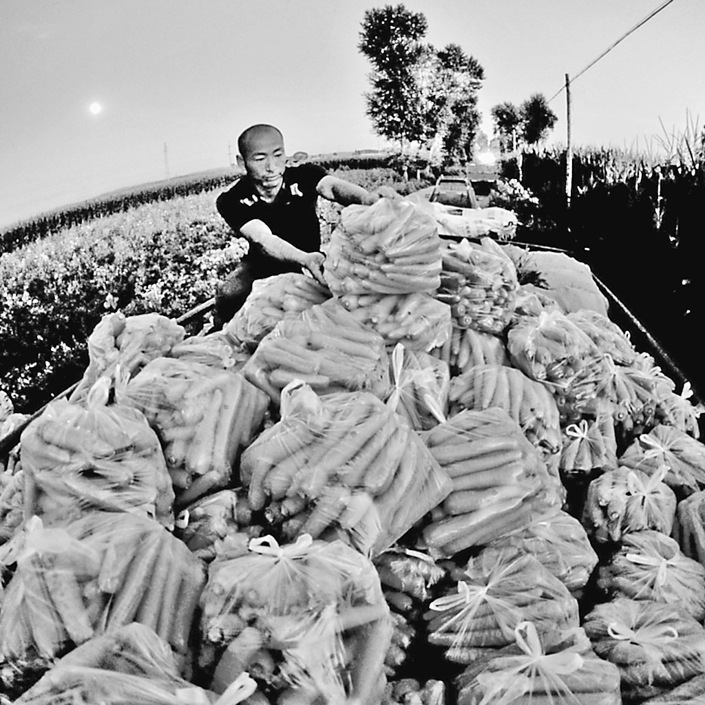 图为月光下合作社社员正在装车胡萝卜准备发往深圳。
