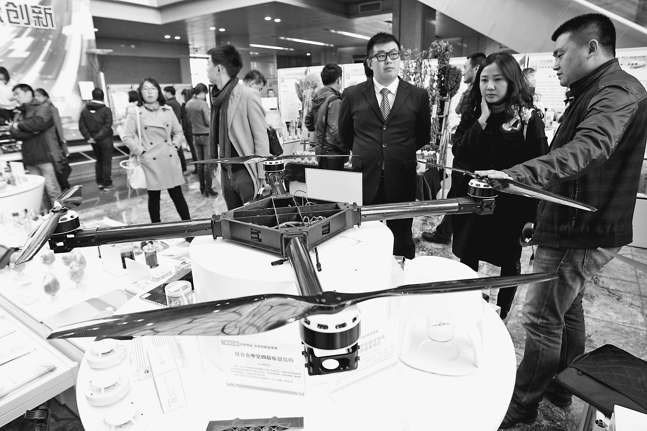 双创周成果展上,哈尔滨一家科技公司研发的无人机受到大家的关注。 本报记者苏强摄