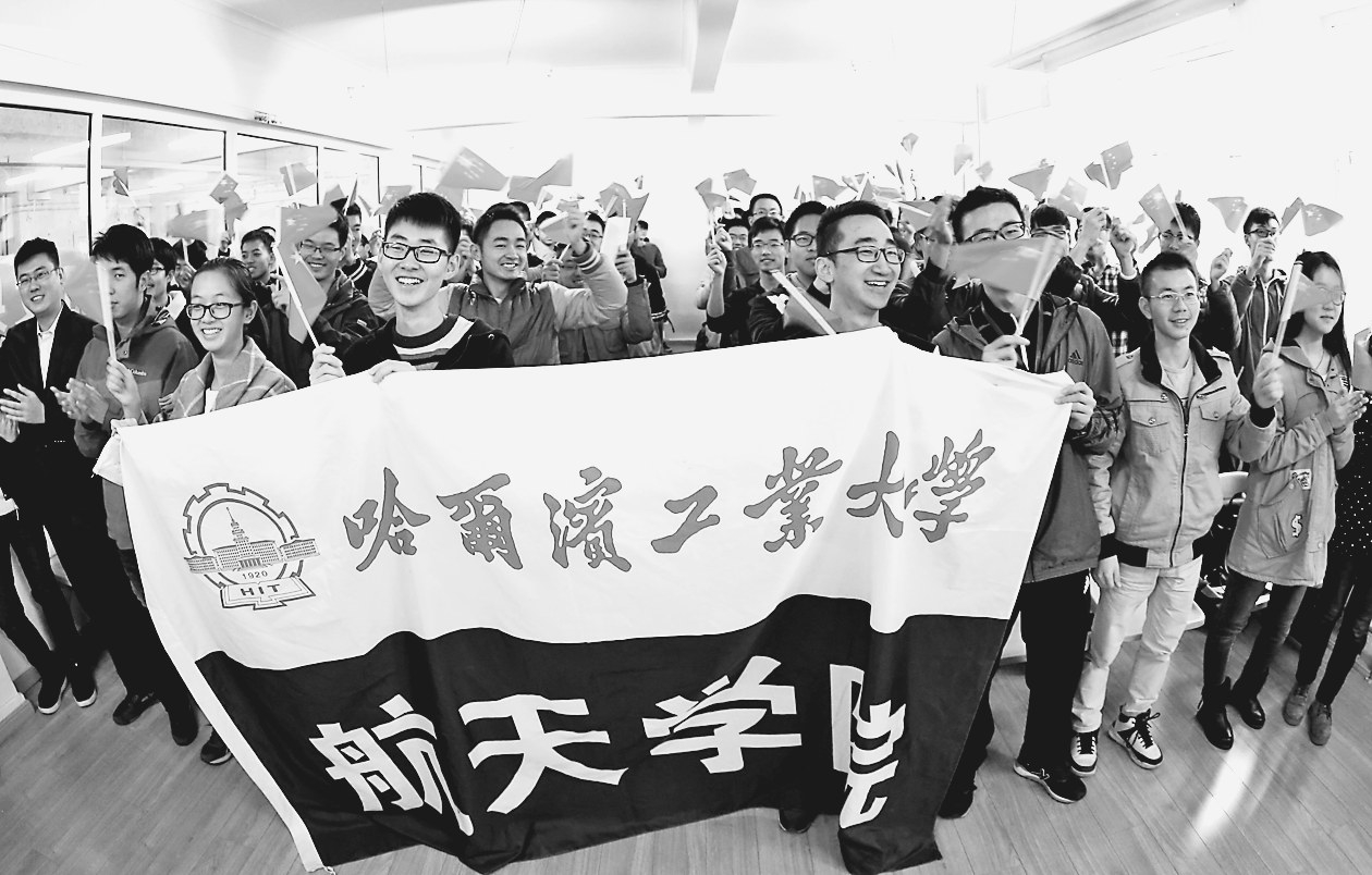 本报17日讯(兰锐记者衣春翔)17日一大早,哈尔滨工业大学航天学院、电气工程及自动化学院等多个学院百余名师生汇聚学校电视直播室,共同观看神舟十一号载人飞船发射电视直播。 飞船发射升空时,学生们挥舞着手中的国旗为飞船发射加油助威,当电视里宣布“神舟十一号载人飞船发射取得圆满成功”时,现场再次响起热烈的欢呼声。一位航天学院学生对记者说,“哈工大先后有500多名教师和技术人员参与神舟系列飞船相关研究工作,50余项研究成果应用到载人航天的各个领域,哈工大人为国家载人航天做出了自己的贡献,我感到十分自豪。未来,我也要为祖国的航天事业发展尽心尽力。”还有许多学生一边观看直播,一边用网络互动交流。“中国航天威武!”、“祝贺祖国航天科技取得的突飞猛进的巨大成就”……一条条评论从指尖发出,表达着同学们对祖国航天事业发展的满满信心。 、 图为哈工大航天学院学生集体收看神舟十一号发射过程。 兰锐本报记者郭俊峰摄