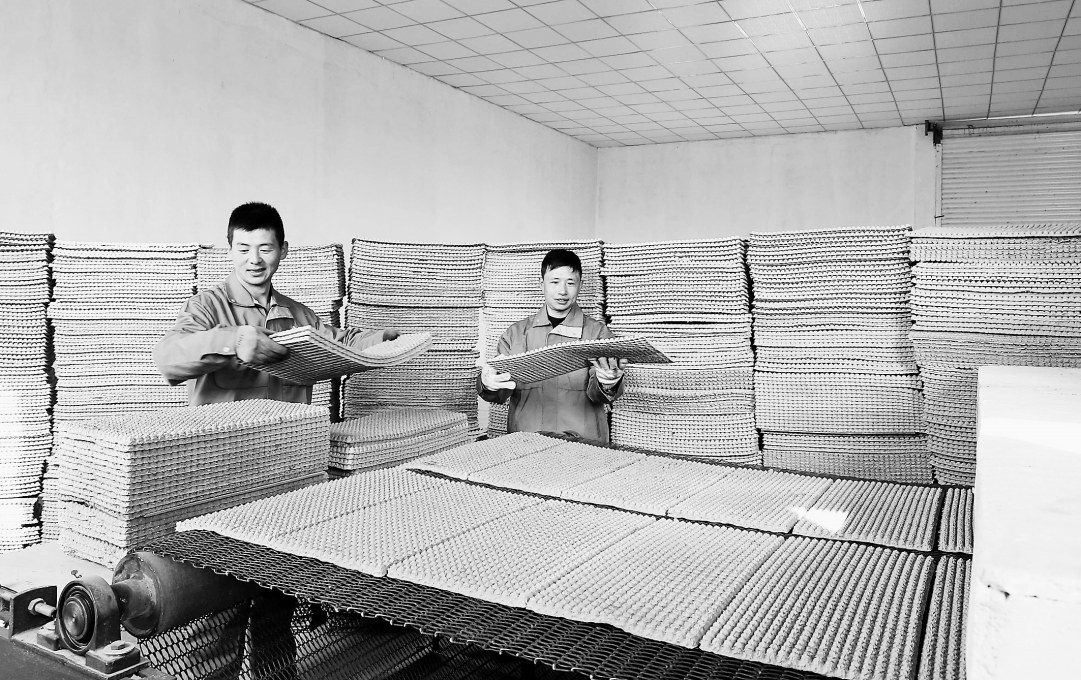 一个小小“营养穴盘”,实现了水稻秸秆的增值利用,引发了水稻栽培模式的技术创新。近日,由黑龙江八一农垦大学自主首创的水稻“秸秆营养穴盘”,在位于富裕县龙安桥镇齐齐哈尔通力农业科技有限公司建起第一条生产线,进行了工厂化生产。图为水稻“秸秆营养穴盘”自动化生产线,工人正在检查和收取穴盘成品。 闯磊本报记者邱成摄