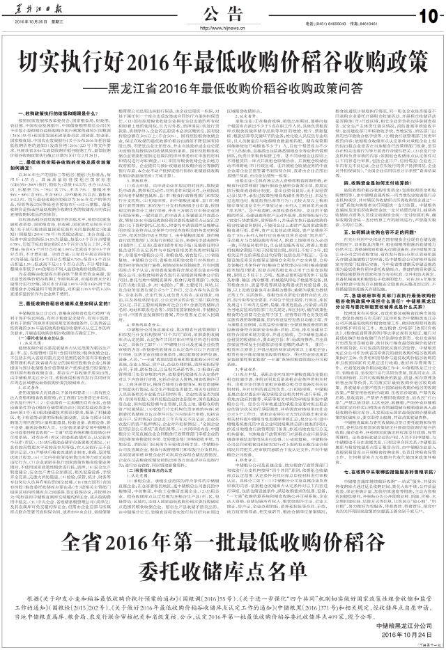 一、收购政策执行的依据和期限是什么? 按照国家发展和改革委员会、国家粮食局、财政部、农业部、中国农业发展银行、中国储备粮管理总公司《关于印发小麦和稻谷最低收购价执行预案的通知》(国粮调〔2016〕55号)和国家发展和改革委员会、财政部、农业部、国家粮食局、中国农业发展银行《关于公布2016年稻谷最低收购价格的通知》(发改价格〔2016〕223号)等文件要求,开展我省2016年最低收购价稻谷收购工作,最低收购价稻谷收购政策执行截止日期为2017年2月28日。 二、最低收购价稻谷收购的价格及质价政策如何确定? 以2016年生产的国标三等稻谷(粳稻)为标准品,每市斤1.55元。具体质量标准按稻谷国家标准(GB1350-2009)执行,指标为:杂质1%以内、水分14.5%以内、出糙率77%~79%(含77%,不含79%)、整精米率55%~58%(含55%,不含58%)、谷外糙米2%以内、黄粒米1%以内。执行最低收购价的稻谷为2016年生产的等内品,相邻等级之间等级差价按每市斤0.02元掌握。最低收购价是指承担最低收购价收购任务的收储库点向农民直接收购标准品的到库价。 非标准品稻谷最低收购价的具体水平,按照《国家发展和改革委、国家粮食局、财政部、国家质检总局关于印发〈关于执行粮油质量国家标准有关问题的规定〉的通知》(国粮发〔2010〕178号)有关规定确定。水分含量:以标准中规定的指标14.5%为基础,每低0.5个百分点增量0.75%,但低于标准规定指标2.5个百分点及以上时,不再增量;每高0.5个百分点扣量1.00%;低或高不足0.5个百分点的,不计增扣量。杂质含量:以标准中规定的指标1%为基础,每低0.5个百分点增量0.75%;每高0.5个百分点扣量1.5%;低或高不足0.5个百分点的,不计增扣量。整精米率低于49%的稻谷不列入最低收购价收购范围。 为妥善解决收储库点稻谷烘干费用的资金来源,促进最低收购价稻谷收购工作顺利开展,对超标准水分扣量部分进行分解,即对水分扣量1.00%中的0.65%用于处理粮食水分减量和干物质损耗,对扣量1.00%中的0.35%直接扣量折价作为企业烘干费用。 三、最低收购价稻谷收储库点是如何认定的? 中储粮黑龙江分公司、省粮食局和省农发行按照“有利于保护农民利益、有利于粮食安全储存、有利于监管、有利于销售”的原则和国家规定的收储条件,以及我省已经明确的2016年最低收购价稻谷收储库点认定工作的有关要求,开展最低收购价稻谷收储库点确定工作。 (一)委托收储库点的认定 1、认定范围。 最低收购价稻谷委托收储库点认定范围为稻谷生产县(市、区,农垦管局)国有(含国有控股)粮食收储企业,不包括未列入省政府重点支持范围的省外国有非粮食经营管理机构在我省境内设立的国有控股粮食企业;具备提供与预计收储粮食价值等额财产抵押或银行担保能力的非国有粮食收储企业。稻谷生产县收储矛盾突出的,由中储粮黑龙江分公司、省粮食局和省农发行共同研究在周边区域增设最低收购价委托收储库点。 2、认定条件。 委托收储库点应具备以下条件和要求:(1)具有独立法人资格和粮食收购资格,在工商部门注册登记并年检,在农发行开户。(2)企业需有一定规模的自有仓容,仓储设施条件符合《粮油仓储管理办法》(国家发展改革委令2009第5号)和《粮油储藏技术规范》要求,配备了机械通风、电子检温等必要的保粮配套设施。具备与预计日收购能力相匹配的计量称重器具、检验设备、清理设备、烘干设备、输送设备和人员。已安装或承诺安装中储粮总公司政策性粮食收购“一卡通”结算系统和粮食收购公开可视系统。对有分库(库区)的委托收储库点,认定到单个分库(库区)。(3)执行粮油仓储单位备案相关规定。(4)具有较高管理水平和较高信用等级,在人民银行无不良资信记录。(5)严格执行粮食流通统计制度,准确、及时报送统计报表。(6)三年内在收储及销售出库等方面无违规违纪行为。(7)企业承诺在执行国家政策性粮食收储业务期间,不使用国家政策性粮食进行抵、质押。(8)安全生产制度健全,安全生产责任全面落实,相关设施设备、手续齐全完善,无重大消防隐患。(9)检验、保管、统计、财务等专业岗位人员具有相应的岗位技能。(10)地方国有(含国有控股)粮食委托收储库点要由县(市)级相关主管部门组织区域内所属库点之间联保,签订联保协议,并按照20元/吨标准向中储粮直属库交纳履约保证金,或从收购费用中抵交。(11)中央企业、省级储备粮管理公司(或单位)及其直属库可免交履约保证金,但需由企业总部与所属库点联合签署书面担保合同,或者由中央企业、省级储备粮管理公司总部出具银行保函,由企业总部统一担保,对其下属任何一个库点违反政策或合同的行为承担担保责任。(12)国有控股粮食收储企业拥有企业设施的所有权和附着土地的使用权,且无对外抵、质押情况(农发行贷款抵、质押除外);企业的注册资本必须实缴到位,国有股持股份额在50%以上(不含50%)。国有控股粮食收储企业,保证在收储的最低收购价稻谷出清前不降低国有持股比例、不降低企业注册资本,并由当地政府或企业总部向省粮食局提供防范收储风险的承诺。国有控股粮食收储企业需委托省指定范围内的律师事务所对申报的材料和情况进行尽职调查。(13)非国有粮食收储企业由地方政府推荐。企业提供与预计收储最低收购价稻谷等额的银行存款、本企业不动产抵押或银行