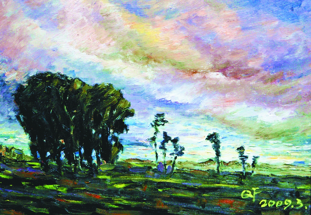□本报记者赵宇清 在画界,齐峰是一个科班出身的非职业画家。他自幼酷爱绘画,曾在大学时代师从于著名油画家李秀实。只不过,因为命运的安排,他进入了另一个行业。但是,画画与他的生活从未分离,无论生活如何变迁,绘画艺术都是他心头放也放不下的追求。 脚下的土地就是画作的根之所系 齐峰的油画是富有动感的,站在他的画前,似能感受到风从田野掠过,似能听到山涧汩汩流淌的声响,似能看到云朵正朝你的头顶飘来……他的画几乎都是塞北风光:阳光下悄然融化的冰川,两排杨树围起来的乡间小路,苍莽幽深的松树林……所有的一切都是你我熟悉得不能再熟悉的家乡景致。 曾经,在读书时,齐峰对于画一些稀松平常的景物是没有兴趣的。他认为,课程里让学生们画的普通的石头或某个院落的墙角十分无趣,这些似乎并不能成为绘画的主题。然而,先生李秀实的话打动了他:“大自然无时无刻不为你奉献着它的美,只不过需要你用一双融入了情感的眼睛去发现它的美。”多年之后,齐峰越来越深刻地体会到了先生话语的真谛。先生所说的情感不就是对故乡、对脚下生活的这片土地最深沉的热爱吗? 齐峰说,对他来讲,故乡就是血液里流动着的“青山绿水”间抹不去的记忆、挥不去的“乡愁”……正是源于这深挚的爱,他喜欢画一条弯弯曲曲的小路或一条时宽时窄的小河奔向远方,默默地寻找“回家”的路;喜爱描绘森林和群山,并把它们置于变幻莫测的天空之下,让不同的色彩赋予它们在不同光景里的美丽;喜欢画静静的白桦林,因为它承载了昔日黑土地垦荒者那逝去的青春年华和美丽记忆…… 绘画是源自心灵的感动,这是一种直接、真实和无障碍的“世界语言”。齐峰认为画那些在画家生命里无根的东西是无法画出其灵魂的,他说,我们要中西合璧,融会贯通,也要画好“自己的画”、传递“自己的声音”、讲述“自己的故事”,要时刻不忘守土有责、留住本根。 身处的时代就是画作的创作之源 能够专心画画的时间被齐峰视作是工作之余最幸福的时光。他的画室布置得大气简单,湖水绿的墙壁配着超宽的木质画框,很有森林气息。画室一隅放着矿泉水、方便面还有电热水壶,想必这些都是齐峰为自己在“闭关”作画时备下的粮食。画室的桌上除了颜料外还散放着许多风景照片。齐峰说,每次坐车下乡工作时,他在车上须臾不敢休息、打盹,一路一直在用手机拍照,生怕与震撼他心灵的景色失之交臂。这些路上拍下的照片都是他宝贵的创作题材。 齐峰画的风景从来都不只是风景,他是在用风景记录时代的变迁。他的画作也不仅仅是书斋里的自娱自乐,每一幅画都承担着相应的社会责任。齐峰指着他眼前的一幅画说,你看上面画的是惊涛击石,实际上我画的是改革浪潮,我要通过这样直击心灵的画面来表现改革大潮对人们观念的巨大冲击,给社会生活引发的巨大变化。齐峰办公桌后面的那幅画,画的是一座被刀斧劈开的山,裸露的红土似在渗血,湛蓝的天空中还隐藏着一条无处可逃的鱼。齐峰解释说,东北大地上被劈开的山很多,覆盖大山的绿色植被就那样被无情地撕去,人们还不知道他们伤害环境所导致的恶果也正在伤害他们自己,长此以往湛蓝的天空必将被乌云笼罩…… 也正是因为对身处时代的不断观察和思考引发了齐峰的创作欲望,这些年来他一直在通过创作体现对时代的一种关注,对现实社会的一种关切,对改造社会、促进社会进步的一种责任和使命。 画家的境界就是画作的魂之所系 对于文艺工作者肩负的责任和使命,齐峰还有着更为深入的思考。感慨于时代赋予当代艺术工作者难得的人生际遇,通过深入学习领会习近平总书记《在文艺工作座谈会上的讲话》,齐峰收获了对艺术、对人生的最佳诠释,深感手中的画笔同样承载着凝重的厚望……画画不是随心所欲,它也有规矩,也有不可触碰之边缘。既不能把作品当作追逐利益的“摇钱树”,也不能只表现一己悲欢、杯水风波,更不能粗糙滥制、牵强附会。 齐峰认为,胸怀决定理念,理念决定思维,思维决定境界。一幅画所展现的就是作者的胸怀、理念、思维和境界。习总书记曾在讲话中说:“我们要走进生活深处,在人民中体悟生活本质、吃透生活底蕴。只有把生活咀嚼透了,完全消化了,才能变成深刻的情节和动人的形象。”我们将其精髓融入绘画艺术创作,就是要在体悟生活本质的基础上,深层次地感受自然本真,冷静地思考和观察生活,从而达到生活与人生的感悟和纯化。 优秀文艺作品是人民的精神食粮。创作者心中有什么,作品上就能看到、听到、读到什么。齐峰说,一幅幅画就是作者无声的语言,是一件件令人可视可读、可观可感的艺术品,必须是灵动而有生气的、丰富而厚重的,决不能是一种简单的复制或加工。作品要既能体现对自然、本真的一种回归,又能在目之所及、手之所触中流淌出宁静、淡泊、不甘、挣扎与渴望……即使是一枝独自盛开的向日葵、一条解冻的溪流,抑或是伸向远方的幽静小路,也要力争让视者蒙尘的心灵获得修复,也要努力去还原人心应有的温软与澄澈…… 齐峰理想中的作品是能体现宁静、淡泊下的张力,这种张力不是具象的勾勒,也不是画者的理论构架,而是细微之处见真知的深厚功力;这种张力脱离了喧嚣与浮华,于平平静静、平平淡淡之中孕育;这种张力是生命