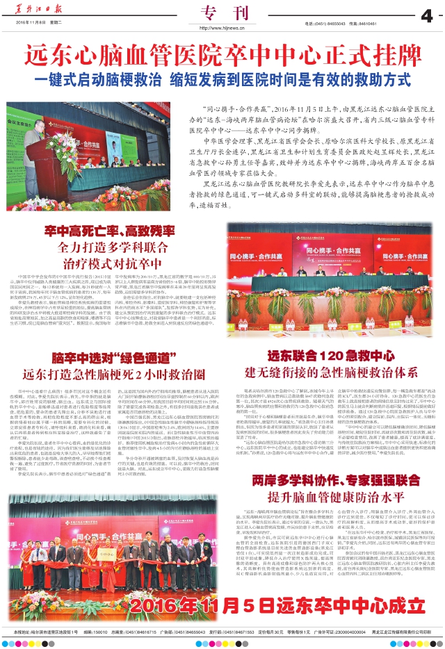 “同心携手·合作共赢”,2016年11月5日上午,由黑龙江远东心脑血管医院主办的“远东-海峡两岸脑血管病论坛”在哈尔滨盛大召开,省内三级心脑血管专科医院卒中中心——远东卒中中心同步揭牌。 中华医学会理事、黑龙江省医学会会长、原哈尔滨医科大学校长、原黑龙江省卫生厅厅长金连弘,黑龙江省卫生和计划生育委员会医政处赵昱辉处长,黑龙江省急救中心孙勇主任等嘉宾,致辞并为远东卒中中心揭牌,海峡两岸五百余名脑血管医疗领域专家莅临大会。 黑龙江远东心脑血管医院教研院长李爱先表示,远东卒中中心作为脑卒中患者抢救的绿色通道,可一键式启动多科室的联动,能够提高脑梗患者的抢救成功率,造福百姓。 卒中高死亡率、高致残率 全力打造多学科联合治疗模式对抗卒中 中国卒中学会发布的《中国卒中流行报告(2015)》显示,脑卒中位列威胁人类健康的三大疾病之首,现已成为我国居民死因之一。每12秒就有一人发病,每21秒就有一人死于该病,我国每年死于脑血管疾病的患者约130万,每年新发病例270万,45岁以下占12%,呈年轻化趋势。 李爱先教授表示,脑血管病是神经系统疾病的重要组成部分,在神经病学中占有举足轻重的地位,提高脑血管病的科研及诊治水平将极大推进神经病学科的发展。由于我省地处高寒地区,加之高盐高脂的饮食和吸烟、嗜酒等不良生活习惯,现已是脑血管病“重灾区”。数据显示,我国每年卒中发病率为200/10万,黑龙江省的数字是400/10万,35岁以上人群发病率是南方省份的5-6倍,脑卒中防控形势异常严峻,黑龙江省脑卒中发病率在未来20年里将呈现高发趋势,迫切需要多学科的协作。 金连弘会长指出,对抗脑卒中,就要组建一支包括神经内科、神经外科、影像科、重症医学科、神经康复和护理等学科在内的高水平“多国部队”,发挥各学科优势,互为补充,建立从预防到治疗再到康复的多学科联合治疗模式。远东卒中中心挂牌成立,对我省脑卒中患者是一个利好消息,标志着脑卒中急救、抢救全面进入到快速反应的绿色通道中。 脑卒中选对“绿色通道” 远东打造急性脑梗死2小时救治圈 卒中中心是看什么病的?很多市民对这个概念还有些模糊。对此,李爱先院长表示,首先,卒中指的就是脑卒中,即百姓常说的脑梗、脑出血。远东成立与国际接轨的卒中中心,是能够迅速对患者进行危险程度等级筛查,把危重的、要命的患者先筛出来,分秒不误地进行通血管手术等抢救,再把危险程度不那么高的筛出来,根据病情看他应属于哪一科的范畴,需要专科化的时候,立即安排患者专科化,请呼吸科来看,请消化科来看,确认后再将患者转到相应科室接受治疗,这样就避免了患者的忙碌。 李爱先院长说,患者在卒中中心看病,走的是优化的诊疗流程,也是省钱的途径。因为我们医生能够及早地筛除出来低危的患者,也就是没啥大事儿的人,早早地帮他们把警报解除,患者就少走弯路,该查啥查啥,不必挨个检查都做一遍,避免了过度医疗,节省医疗资源的同时,为患者节省了费用。 李爱先院长表示,脑卒中患者必须选对“绿色通道”救治,这是因为国内外治疗指南均推荐,脑梗患者从进入医院大门到开始静脉溶栓时间应尽量控制在60分钟以内,欧洲平均时间在68分钟,而我国目前平均时间则达到116分钟,除了需要完成各项检查之外,有很多时间是耽误在患者或家属是否同意溶栓的决策上。 中国百强名医、黑龙江远东心脑血管医院首席顾问刘晓谦教授指出,《中国急性缺血性脑卒中静脉溶栓指导规范(2016)》显示,中国溶栓率为2.4%,欧洲则为14.6%,主要原因就是院前和院内的延迟。而《急性缺血性卒中血管内治疗指南(中国2015)》指出,动脉溶栓开始越早,临床预后越好。推荐使用机械取栓治疗发病6小时内的急性前循环大血管闭塞性卒中,发病4.5小时内可在静脉溶栓的基础上实施。 争分夺秒开通被堵塞的血管,及时恢复大脑血流是治疗的关键,也是有效的措施。可以说,脑卒中的救治,时间就是大脑。对此,远东成立卒中中心,更致力打造急性脑梗死2小时救治圈。 远东联合120急救中心 建无缝衔接的急性脑梗救治体系 笔者从哈尔滨市120急救中心了解到,冰城今年上半年的急救病例中,脑血管病以总救助数5847次稳列急救第一位,其次才是4924次心血管疾病救助。随着天气的寒冷,脑血管疾病的出警和抢救仍为120急救中心院前急救的第一位。 “时间对于心梗和脑梗患者而言就是生命,脑卒中患者抢救得越早,康复的几率就越大。”省急救中心主任孙勇指出,但因为很多患者和家属的错误认识,耽误了患者从发病到医院的时间,很多脑梗患者因此丧失了劳动能力甚至丢了性命。 “远东心脑血管医院是哈尔滨市急救中心香坊第三分中心,远东医院卒中中心的成立,也是建立脑卒中快速反应机制。”孙勇说,120急救中心将与远东卒中中心合作,建立脑卒中抢救快速反应微信群,每一辆急救车都是“流动的ICU”,医生都24小时待命。120急救中心的医生在急救车上就直接把患者的病情信息实时传过来了,卒中中心的医生马上就会判断病情并迅速回复,根据情况提前做好接诊准备。通过120急救中心院前急救医护人员与卒中中心的密切配合,建立院前、院内、出院后一体化、无缝衔接的急性脑梗救治体系。 “卒中中心的建立可以降低脑梗确诊时间、降低脑梗溶栓时间、缩短住院时间、