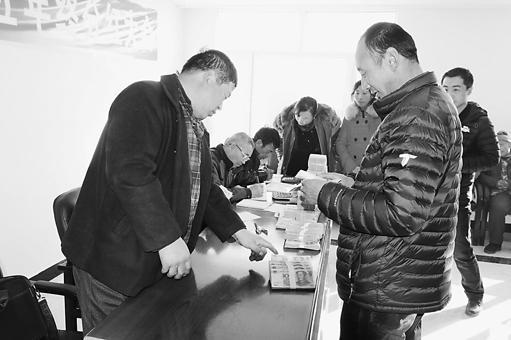 □文/摄梁宪龙范新新本报记者程瑶 11月1日,绥棱县四海店镇宝山村复合社会议大厅里挤满了前来参加分红大会的村民。“今天下午就分红啦,老陈你分多少啊?”“分个六七万吧,你得多点吧?”“还是入社好啊,要不,就你那点地能挣这么多钱吗?”会议还没开始,参会的村民就开始七嘴八舌地议论,兴奋之情溢于言表。 “大家静一静啊,分红大会现在开始!请大家排好队,马上开始分红!”宝山村党总支书记逯德民的开场白刚落,会场就响起了雷鸣般的掌声。 “程亮4.8万元、李彬5.15万元、梁晓忠11.24万元……”村会计宣读着拿到分红的村民名单,一打打崭新的钞票被发放到每位欢喜的村民手中。“你说我这岁数啥都不能干了,还能分到这么多钱,我能不高兴吗!”捧着刚分到的3.2万元钱,68岁的村民许连军笑得合不拢嘴。从复合社成立之初,他就将自家的41亩土地加入到复合社,入社的5年时间里,他感受最多的就是家庭收入的逐年增长。“村集体统一耕种、经营管理、收割,比自己种可强太多了!”入社两年的社员卢胜波也表示,自己种地各种费用都很高,参加复合社一垧地多收入两三千块钱不成问题。今年年头不好,年终还分到10万元,都是托了合作社的福! 捧着沉甸甸的钞票,村民们享受着今年收获的喜悦,也开始畅谈明年的期望:“地交给复合社,咱坐等分红就行。我都联系好了,过了年就去哈尔滨干水暖,一年咋说也还能挣个万八的,这不又是一笔钱吗?你去不去,我帮你联系。”村民吕文鼓动着同样解放了劳动力的其他社员跟他一起外出闯荡。 “今天咱们是给第一批的30人分红,接下来的几天将陆续把钱发放给其他社员。散会!”刚刚说完结束语,逯德民就被四海镇镇长田刚拉住了:“今年的分红总数是多少?”“每亩地分720元,全村农户分红能达到1012万元。村集体增收了36万元,村里的57户贫困户也全都脱贫啦!”逯德民眉飞色舞、如数家珍地报出了这一连串数字。“看来这以村为基本单元的复合型合作社还真能实现不但‘种得好’更要‘销得好’,既富群众,又富集体。明年我们在全镇推广你们村的模式,到时候你可得好好传授经验啊!”田刚边说边和逯德民笑着离开了会场。