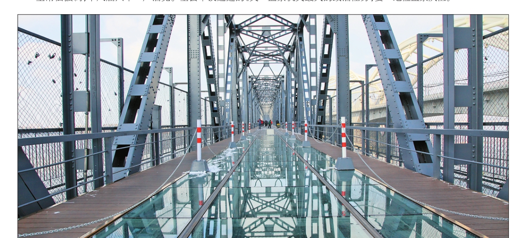 据了解,原滨洲线松花江铁路大桥修缮工程于8月下旬开工建设,为展示原滨洲线松花江铁路大桥百年历史文化,按照规划设计方案,在桥面铺装时设置了3处长24米、宽3米的钢化玻璃透空展示区,透过玻璃可直接俯瞰下面的铁轨、枕木、钢梁等原桥风貌及江面,成为中东铁路公园一道亮丽的风景线。 李因楠本报记者邢汉夫摄