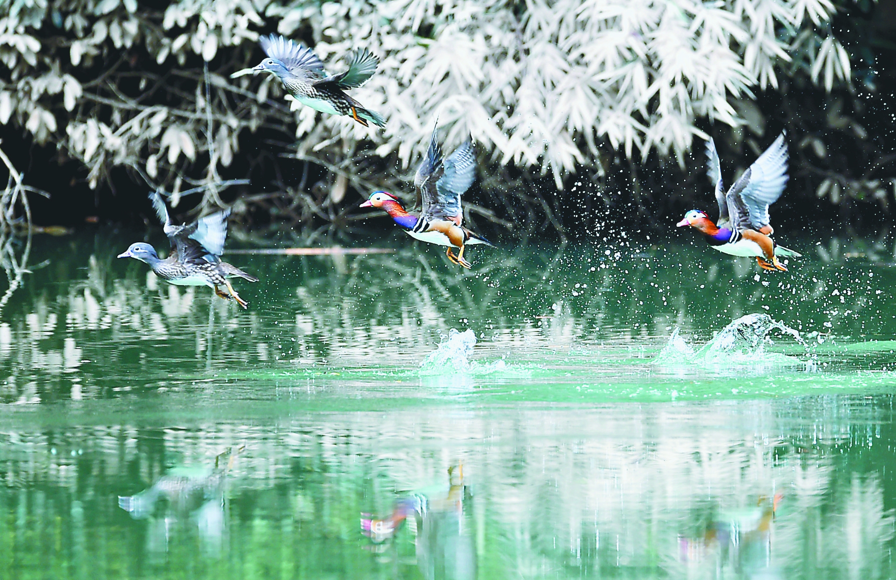 11月30日,在福建省明溪县夏坊乡中溪村,野生鸳鸯在溪水上展翅飞翔。