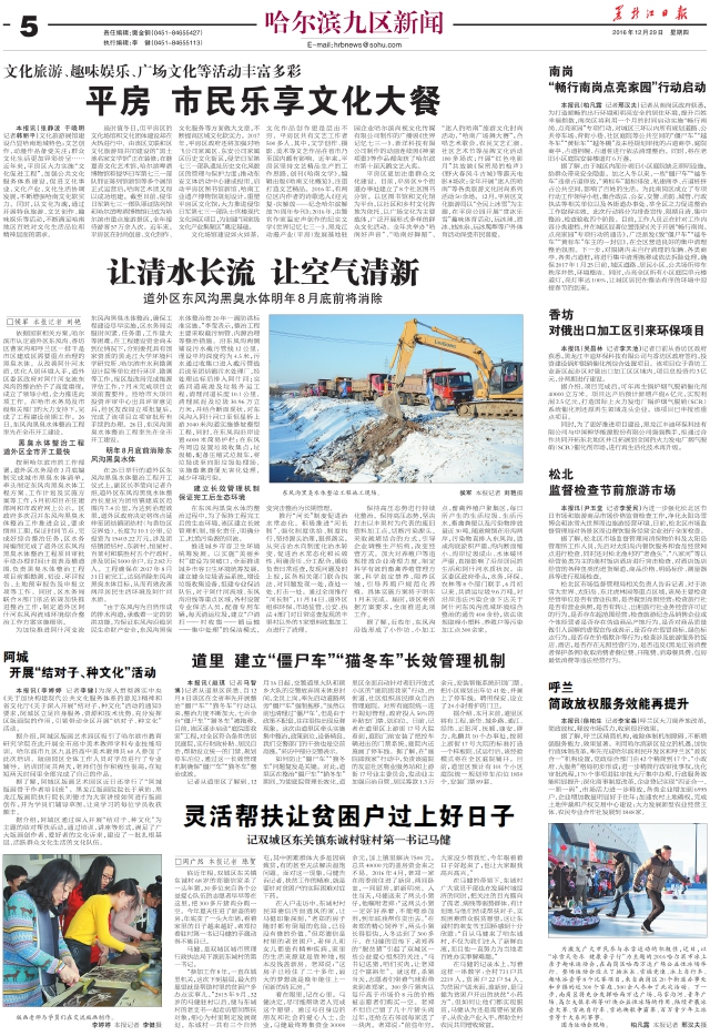 本报讯(张静波于晓明 记者韩丽平)文化旅游展馆建设凸显哈南地域特色;文艺创作、动漫作品备受关注;群众文化生活更加异彩纷呈……近年来,平房区大力实施“文化促进工程”,加强公共文化服务体系建设,促进文化事业、文化产业、文化生活协调发展,不断增强哈南文化软实力。同时,以文化为魂,通过开展特色旅游、文艺创作、趣味娱乐等活动,不断满足哈南地区百姓对文化生活品位和精神层面的需求。 虽时值冬日,但平房区的文化场馆和文化团体建设却在火热进行中。由该区文联和区文化旅游局共同建设的“黑土地名家文学馆”正在装修;在继夏青文化艺术馆、哈尔滨啤酒博物馆和侵华日军第七三一部队罪证陈列馆新馆等多个展馆正式运营后,哈南艺术团又得以成功组建。截至目前,侵华日军第七三一部队罪证陈列馆和哈尔滨啤酒博物馆已成为哈尔滨市重点旅游景区,全年接待游客57万余人次。近年来,平房区在时尚创意、文化制作、文化服务等方面做大文章,不断提高区域文化软实力。2017年,平房区政府还将加强对哈飞公司家属区、东安公司家属区历史文化街区,侵华日军第七三一部队遗址历史文化风貌区的管理与保护力度;推动东安文体活动中心建成投用,启动平房区图书馆新馆、哈南工业遗产博物馆规划设计,重塑平房区文化馆;大力推进侵华日军第七三一部队士官楼现代文化园区项目,为创建“国家级文化产业集聚区”奠定基础。 文化场馆建设如火如荼,文化作品创作更是层出不穷。平房区共有文艺工作者500多人,其中,文学创作、摄影、美术等文艺作品在省市乃至国内颇有影响。近年来,平房区坚持文艺精品生产的工作思路,创刊《哈南文学》,编辑出版《哈南文化概览》,注重打造文艺精品。2016年,有两位区内作者的诗歌选入《迎光复·庆解放——纪念哈尔滨解放70周年专刊》;2016年,由警官作家温宏声创作的纪实文学《世界记忆七三一》、黑龙江动漫产业(平房)发展基地驻园企业哈尔滨尚视文化传媒有限公司制作的广播剧《世界记忆七三一》、新洋科技有限公司制作的动画连续剧《神童项橐》等作品都荣获了哈尔滨市第十届天鹅文艺大奖。 平房区更加注重群众文化建设。目前,平房区9个街道办事处建立了8个社区图书分馆。以区图书馆和文化馆为平台,以社区和乡村文化阵地为依托,以广场文化为主要载体,广泛开展形式多样的群众文化活动。全年共举办“哈南好声音”、“哈南好舞蹈”、“迷人的哈南”旅游文化时尚活动,“哈南广场舞大赛”,合唱艺术歌会,农民文艺汇演,社区艺术节等品牌文化活动180多场次;开展“红色电影月”共放映《保密局的枪声》《野火春风斗古城》等露天电影8场次;全年开展“迷人的哈南”等各类旅游文化时尚系列活动50余场。12月,平房区文化旅游局以“全民上冰雪”为主题,在平房公园开展“赏冰乐雪”趣味体育活动,玩冰球、滑冰、抽冰尜、玩冰爬犁等户外体育活动深受市民喜爱。