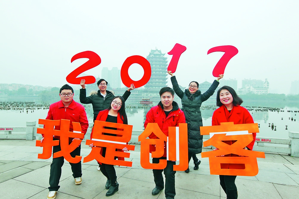 2016年12月31日,四川省眉山市彭山区创业孵化园的“创客”手持“2017”字牌合影,迎接新年的到来。新华社发