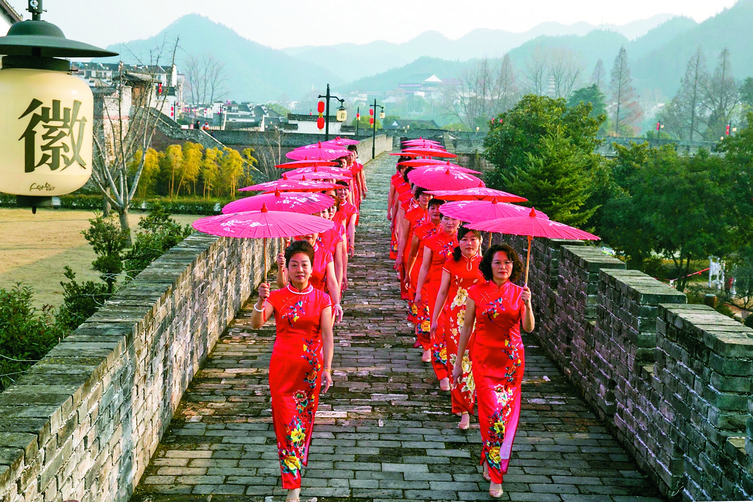 2016年12月30日,旗袍爱好者手撑油纸伞在安徽省黄山市歙县徽州古城墙上走秀,迎接新年的到来。 新华社发