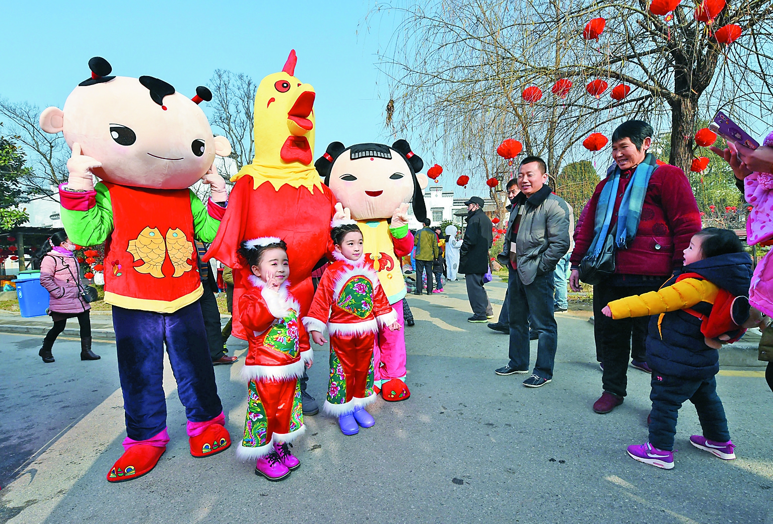2016年12月31日,演员装扮成中华春节吉祥娃娃“年娃”(后排左)、“春妮”(后排右)和卡通金鸡造型(后排中)在庙会现场巡演。当日,“中华春节符号”首届春节动漫庙会在南京市江宁区“世凹桃源”开幕。本届庙会着重以动漫形式展现春节传统文化、介绍春节民俗年俗,并将举办一系列民俗、非遗表演以及文创产品、传统食品展销。新华社记者孙参摄