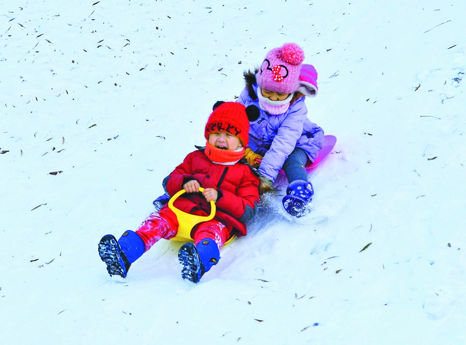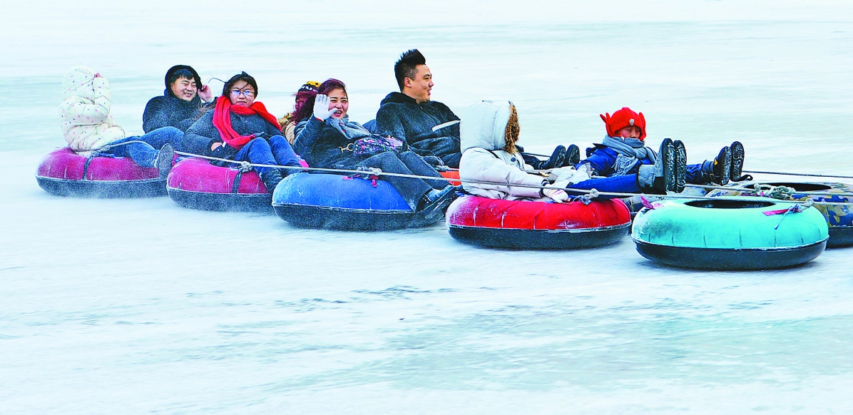 图①摩托车接雪圈,惊险刺激。 图②很少见到雪的孩子们玩得兴高采烈。 图③在松花江上一处游乐场冰面上,游人驾驭着彩色的冰帆乘风疾行。 本报记者高明摄