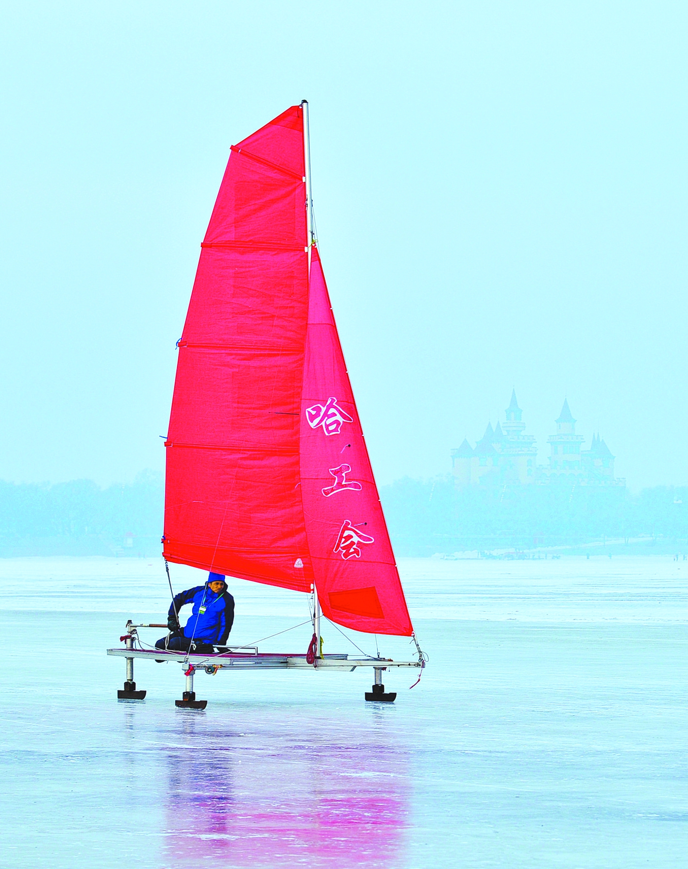 图③在松花江上一处游乐场冰面上,游人驾驭着彩色的冰帆乘风疾行。