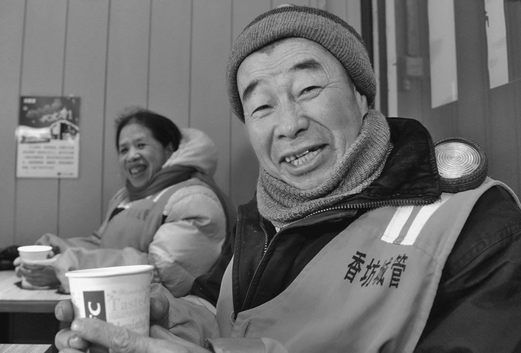 近几天,哈尔滨最高温度已经降到零下19℃,寒冷的天气增加了室外工作难度。许多临街店铺、企业纷纷敞开大门,让环卫工人、交警走进来,喝杯热水暖和暖和。图为哈尔滨市香坊区的环卫工人在一商家内设立的御寒站喝热水休息。 本报记者郭俊峰摄