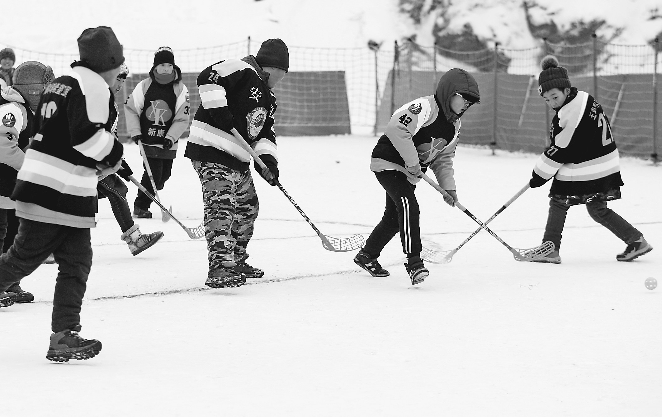 近日,哈尔滨市道里区江畔免费开放的赏冰乐雪园内,两所小学校的学生进行了雪地曲棍球比赛。孩子们奔跑着、欢笑着,感受着冬季运动的乐趣。 本报记者苏强摄